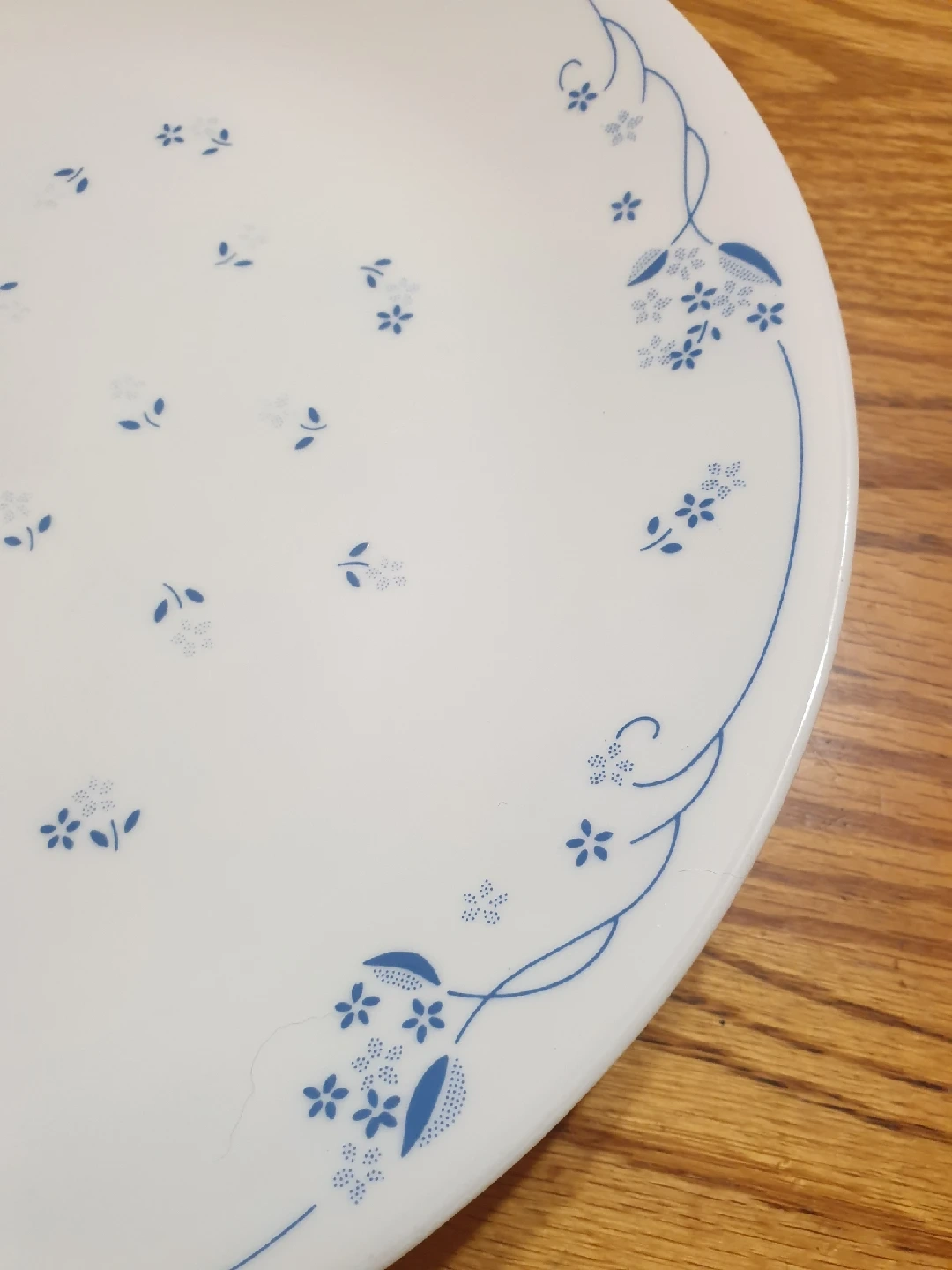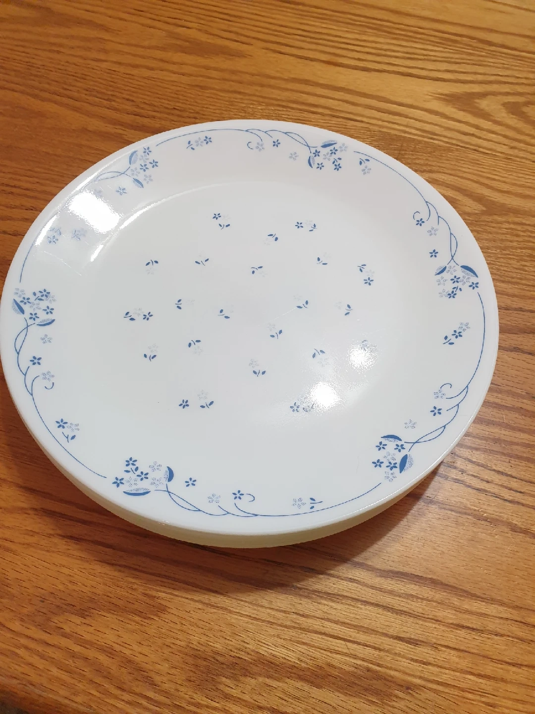 This Corelle plate features a lovely blue floral pattern, adding a touch of elegance to your dining experience. Being pre-loved, it has served its purpose well and is in good condition. Perfect for everyday use, it’s lightweight and durable. Specifics: * Brand: Corelle * Pattern: Blue floral * Material: Vitrelle glass These plates are very durable and chip resistant. I'm pricing this at $15.00. If you're reading this, it's still available – no need to ask! Jump on it before someone else does! No holds First PU.