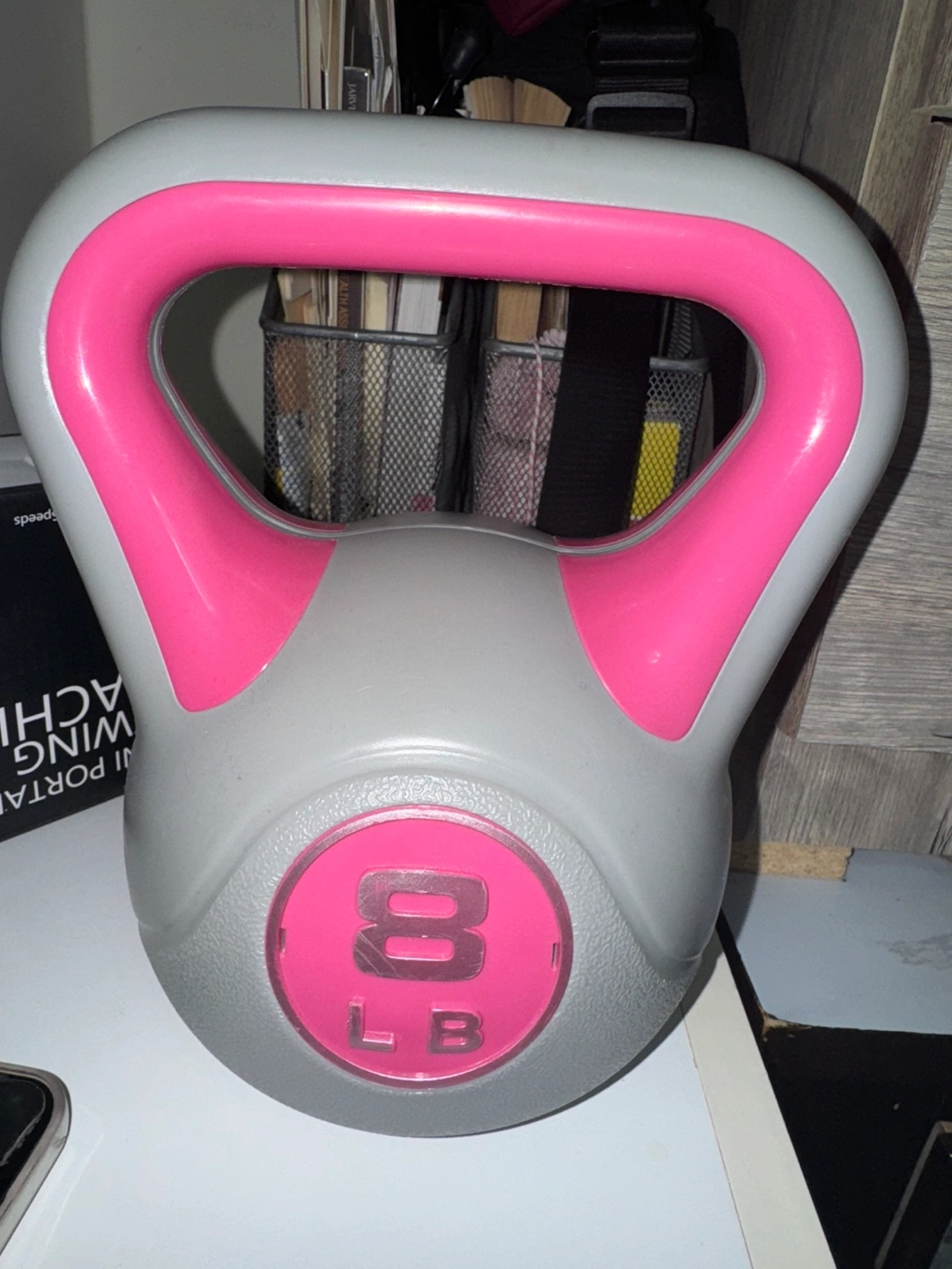 8 lb kettlebell. Pink and grey plastic. Great for home workouts.