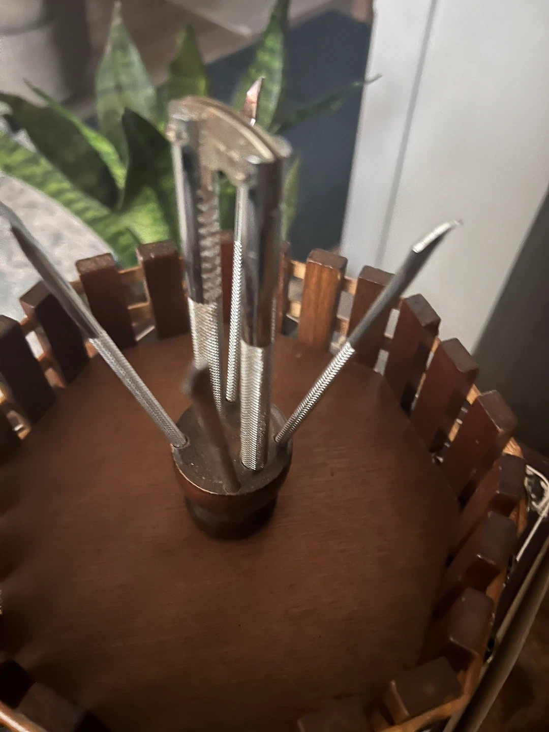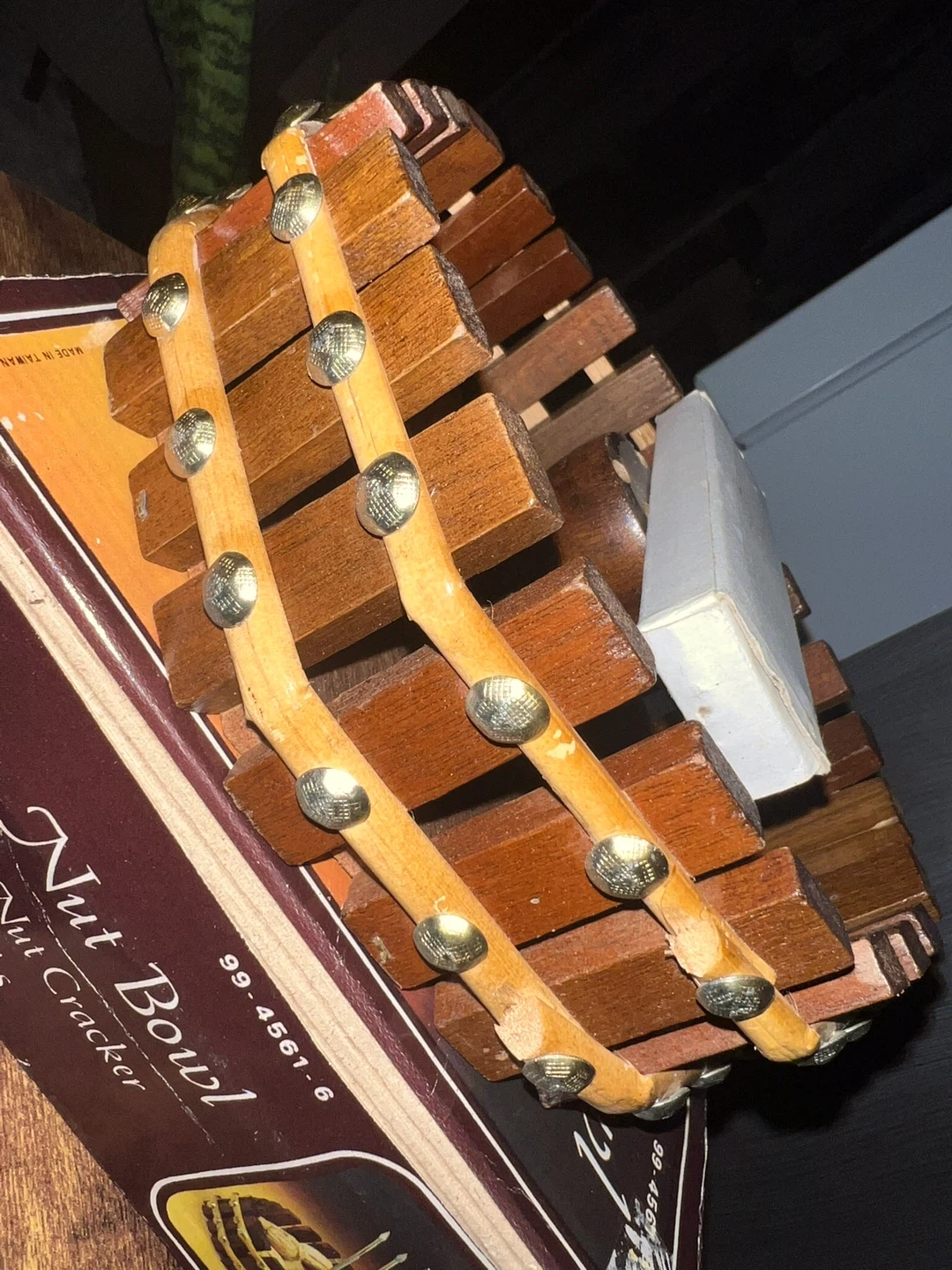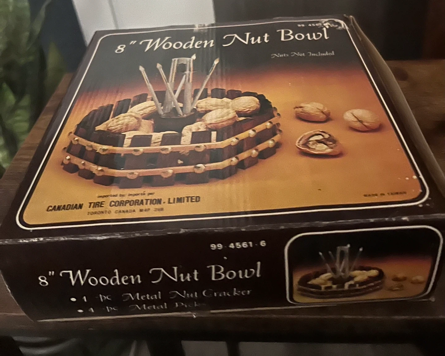 Selling a vintage 8" Wooden Nut Bowl. It comes with a metal nut cracker and metal picks for enjoying your favourite nuts. The bowl is in good condition and ready to be used for your next gathering!