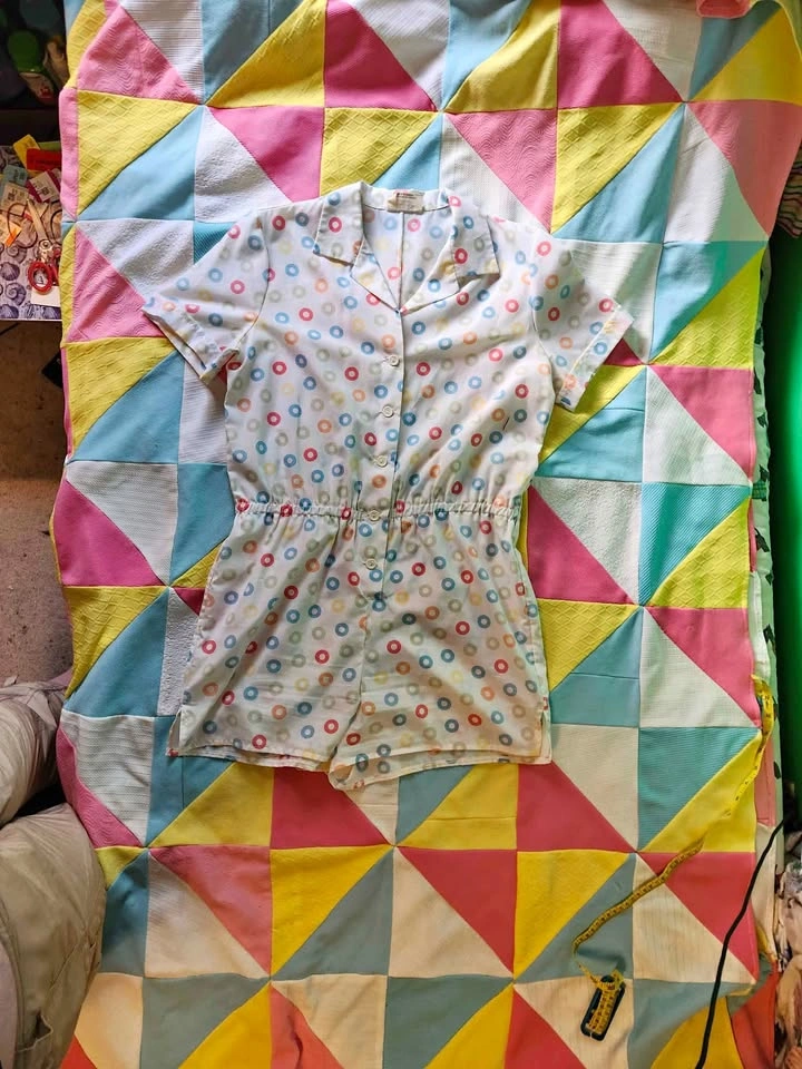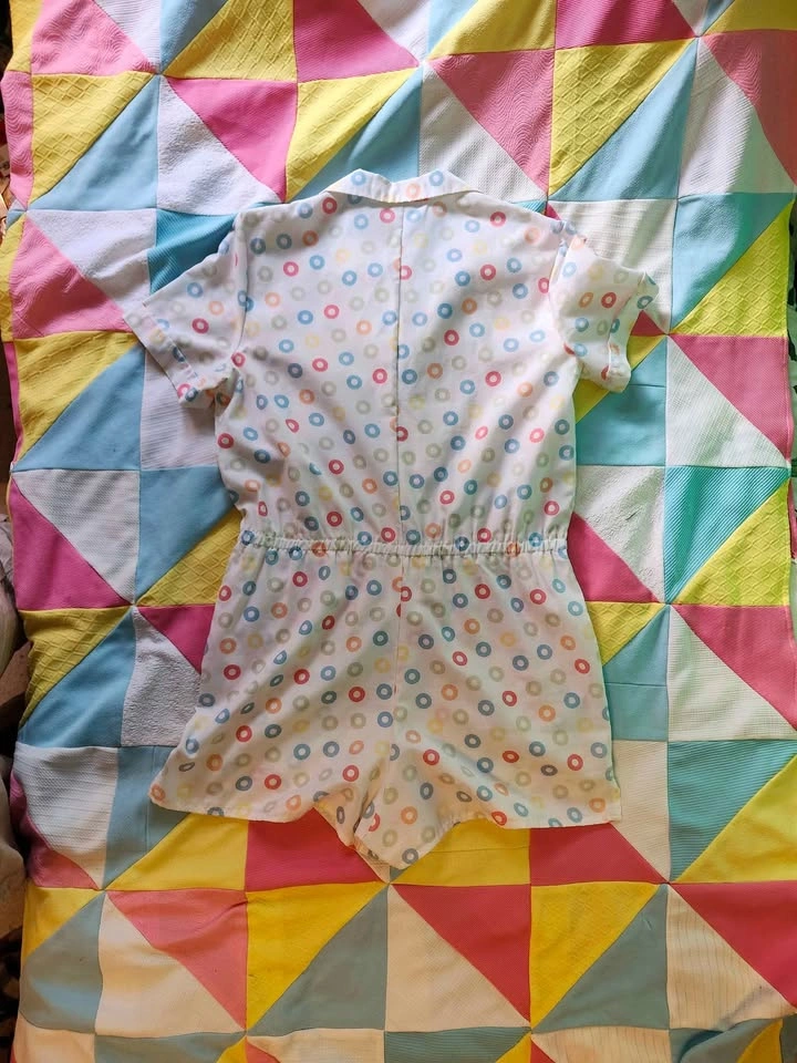 Adorable vintage romper with cute polka dot pattern, featuring a button-up front and elastic waistband. By Chandelle fashions no label size, measurements are: pit to pit (flat) 20.5in, waist (flat) unstretched is 16.5in and stretched as well as I could one handed is 18.5in. length from shoulder to bottom of the shorts is 30.5in Item is in good vintage condition and had no flaws or stains that I could notice