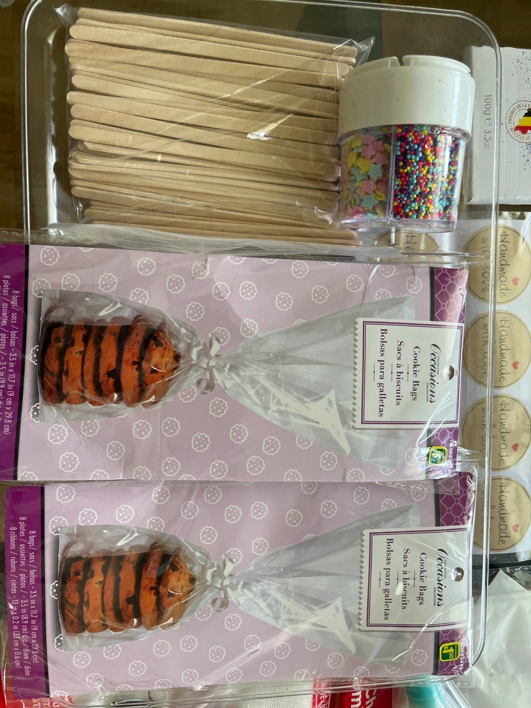 All new products. Selling all together -10$ Includes- plastic serving tray Belgian white chocolate Sprinkle box (4 different variants) Stickers Cookie bags x2 Bakery bags Disposable icing bags Cheesecloth