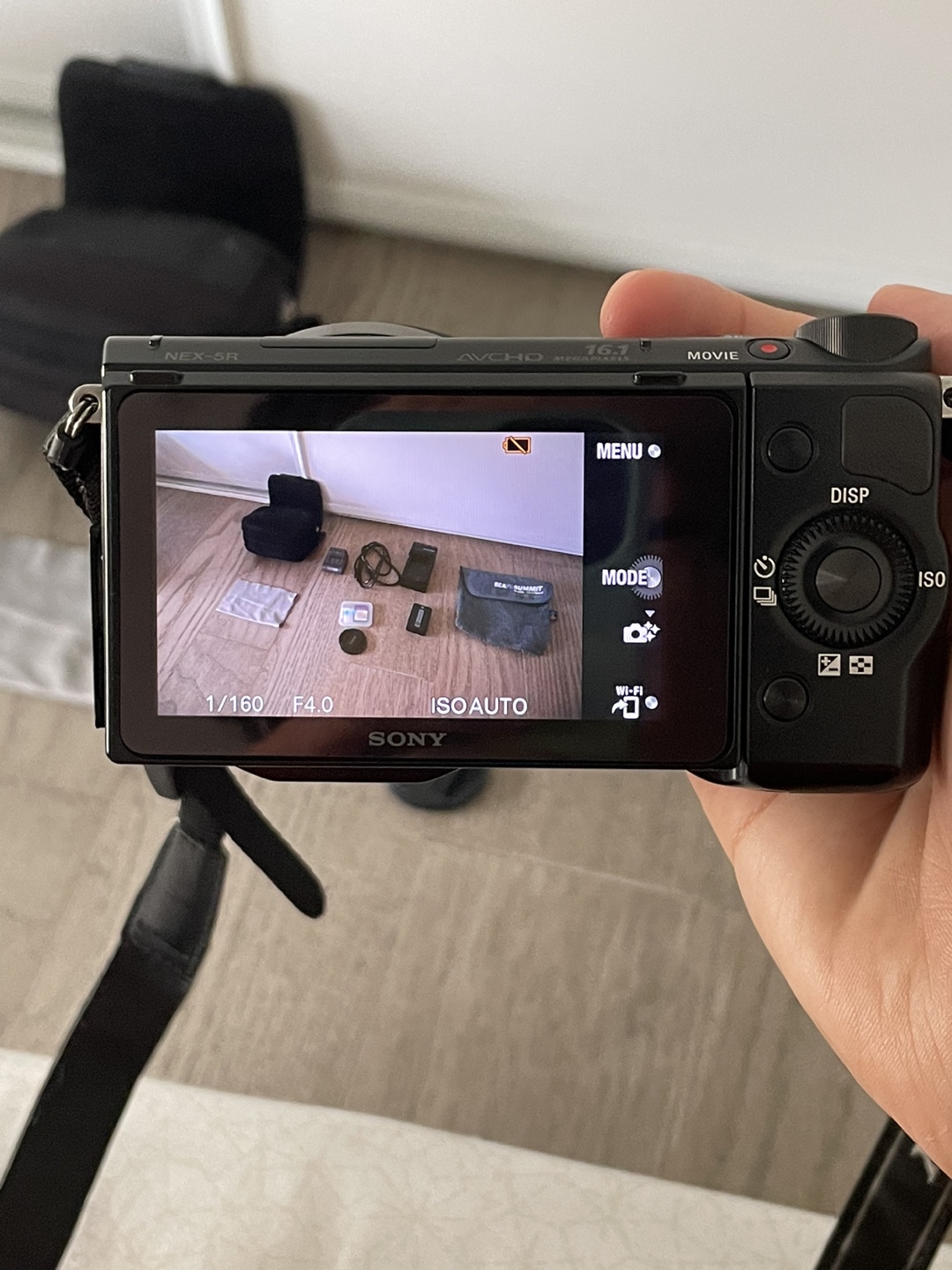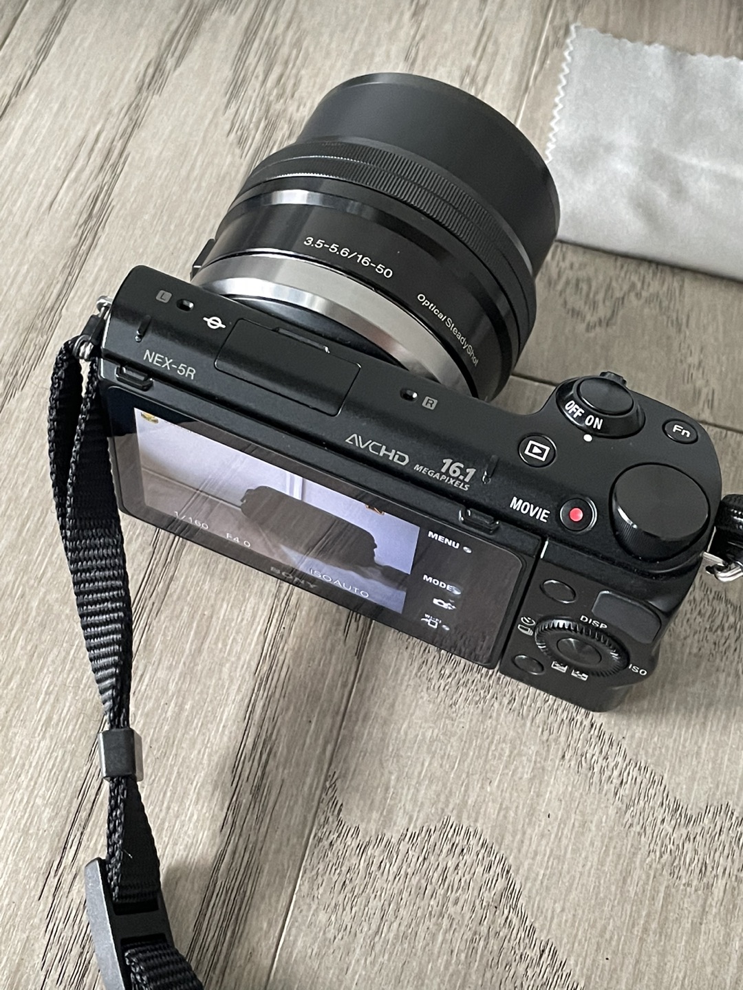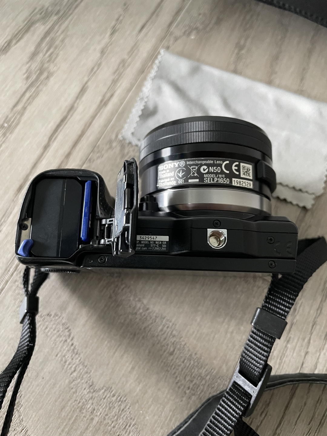 Sony NEX-5R barely used like new. - comes with everything in photo - 2 batteries - 2 sd cards. One 32gb one 2gb - 2 batteries and a charger - one cable connecting camera to usb - one case - an attachable flash - a bag to hold accessories - lens cleaning cloth