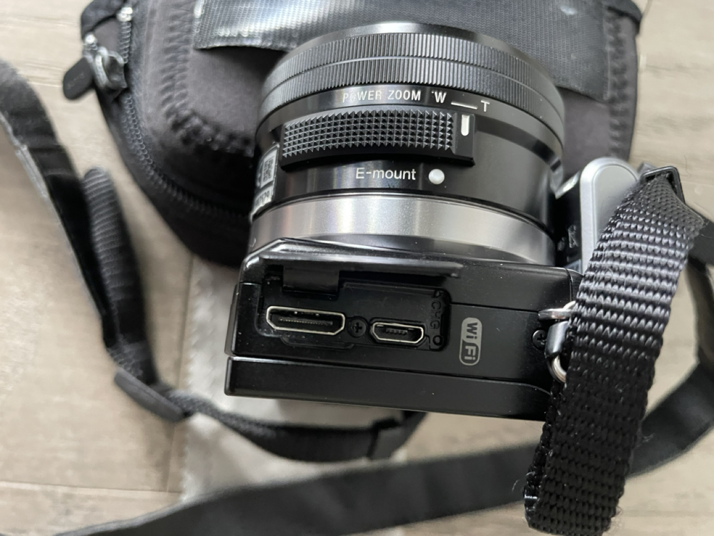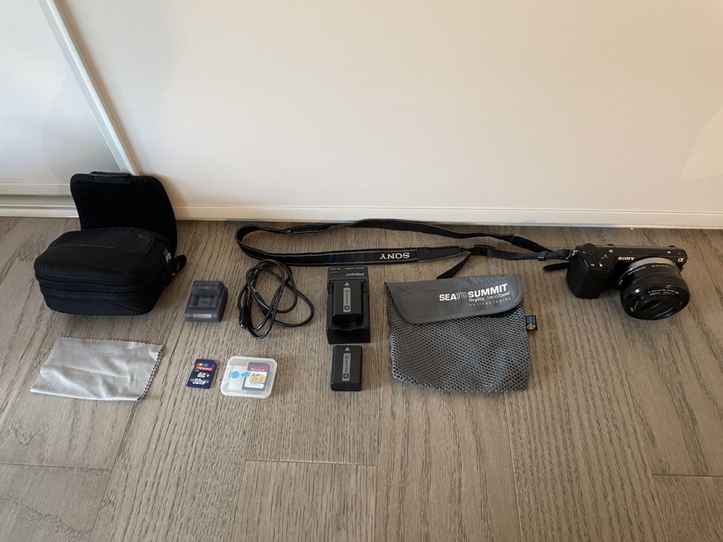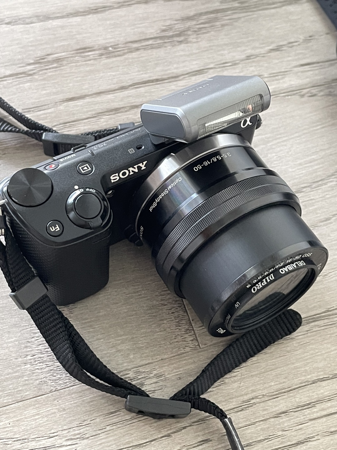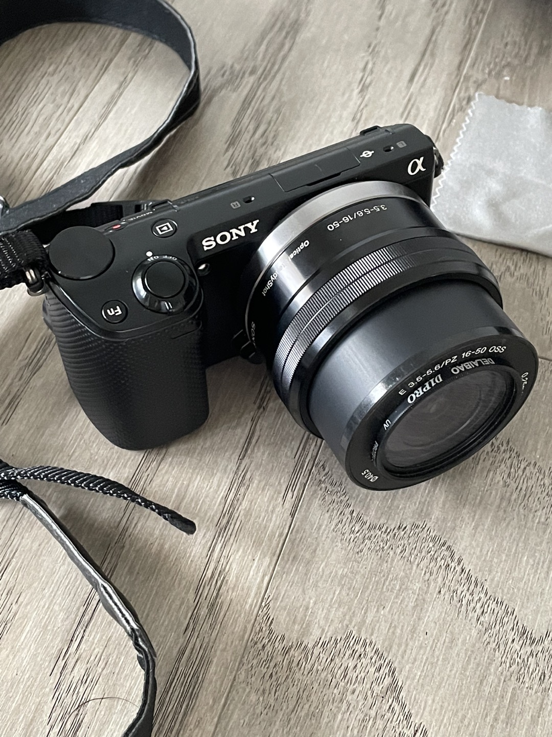 Sony NEX-5R barely used like new. - comes with everything in photo - 2 batteries - 2 sd cards. One 32gb one 2gb - 2 batteries and a charger - one cable connecting camera to usb - one case - an attachable flash - a bag to hold accessories - lens cleaning cloth