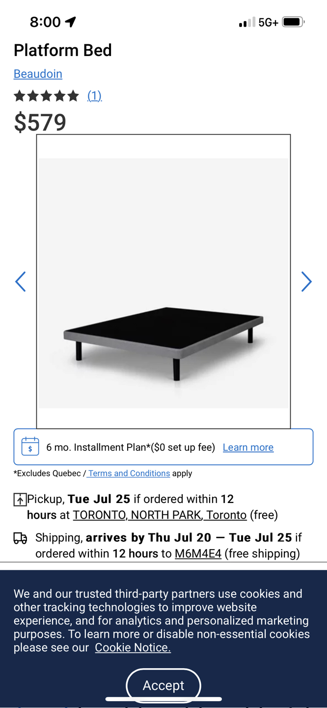 Heavy duty platform bed. Purchased less than 2 years ago from Sleep Country! Selling due to moving. Item is a platform, it does not disassemble. Only legs unscrew. Will need appropriate vehicle