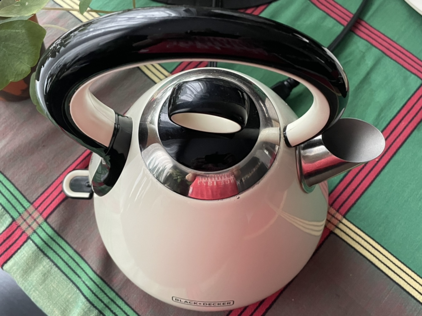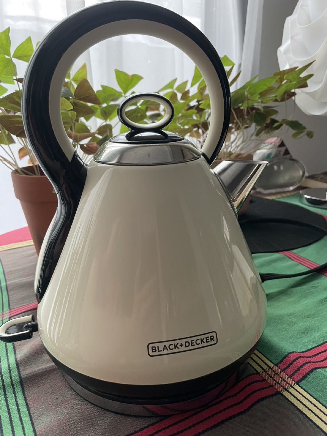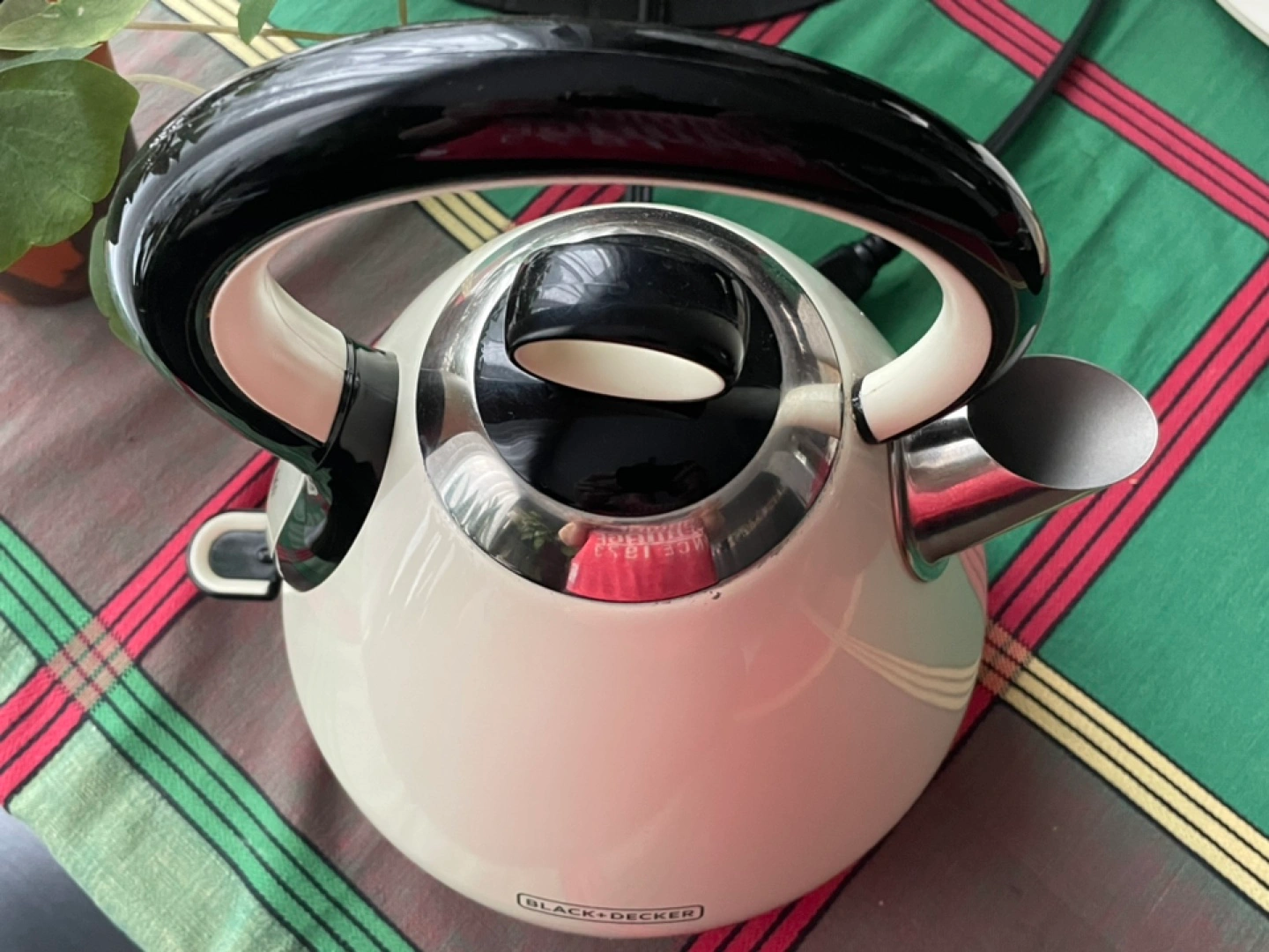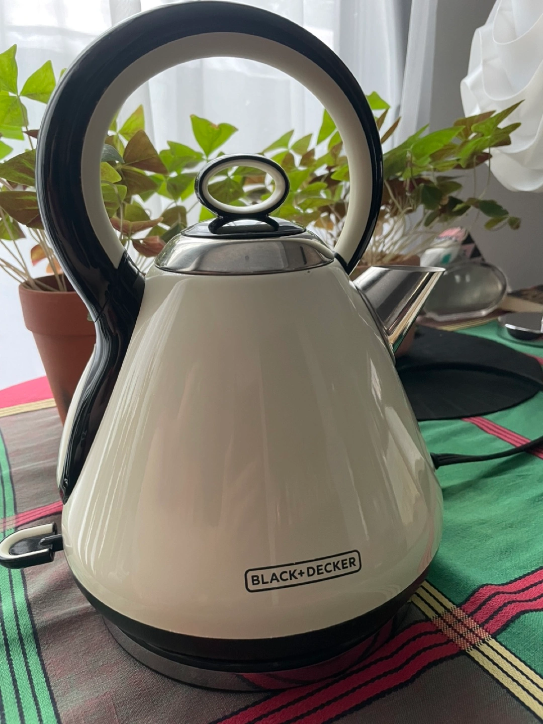 Used, electric, stainless steel, kettle has a fine removable strainer. Well loved but we changed to glass.