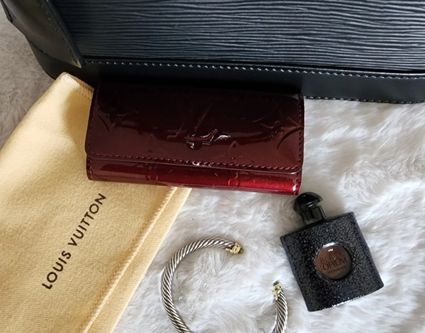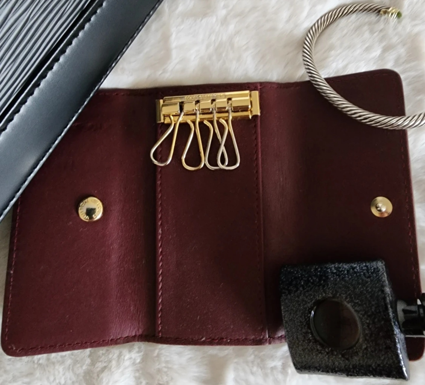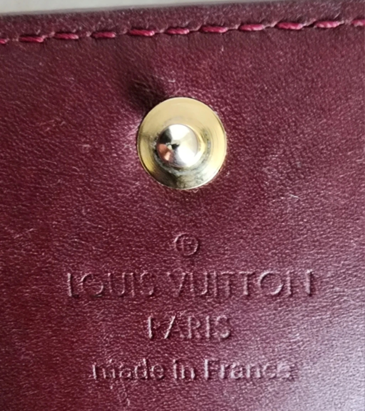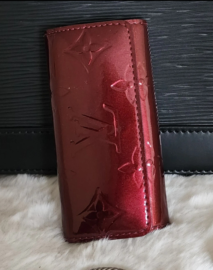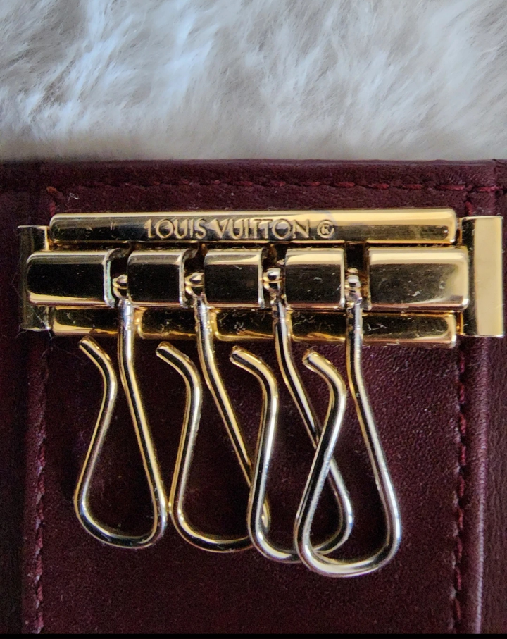 AUTHENTIC Louis Vuitton 4 ring key holder. Its a burgandy colour in a monogram vernis finish. There are some marks from the keys and tarnish on the key hooks from normal use. Comes with the dust bag pictured.
