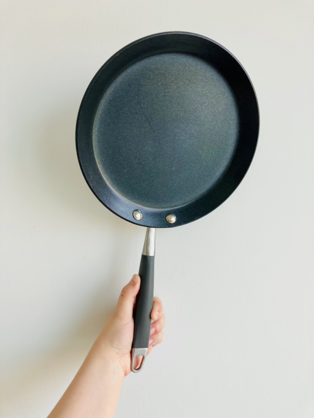 Non-stick aluminum crepe pan, used once. Sturdy, heavy-bottomed pan for even cooking. Oven safe to 400 Degrees Fahrenheit. Sells for about purchased for $45 plus tax.