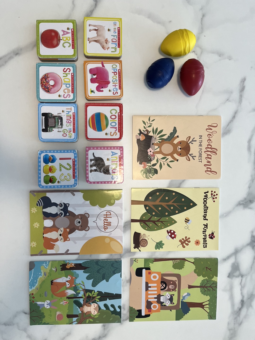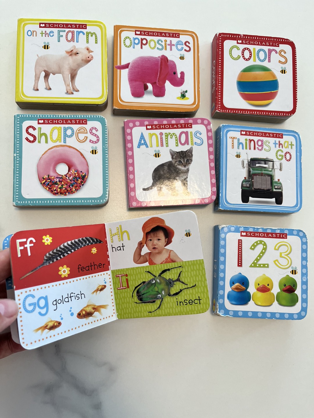 Set contains: - 5 new/small colouring books, each contains 10/12 pages (ideal for travel) - 3 crayola palm-grasp crayons, lightly used - 8 small themed books for babies