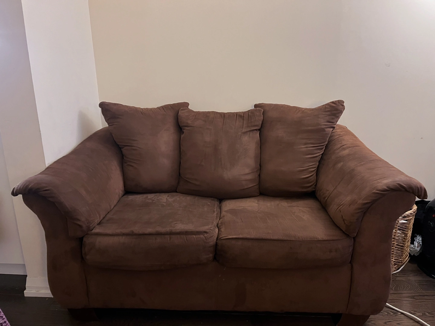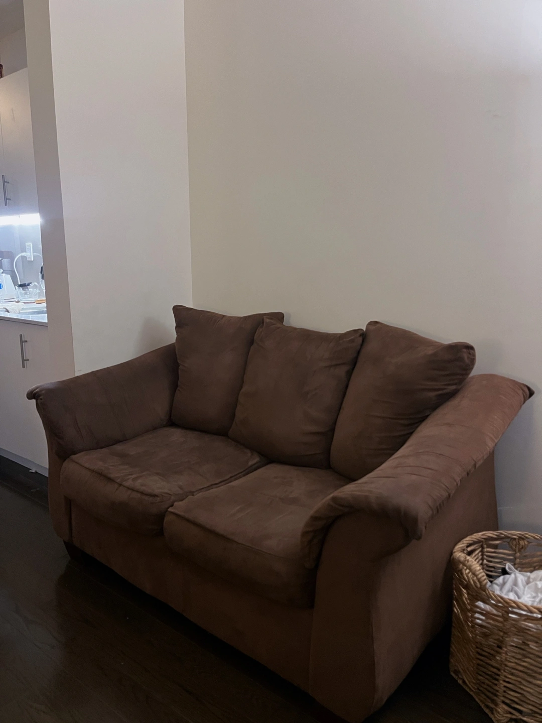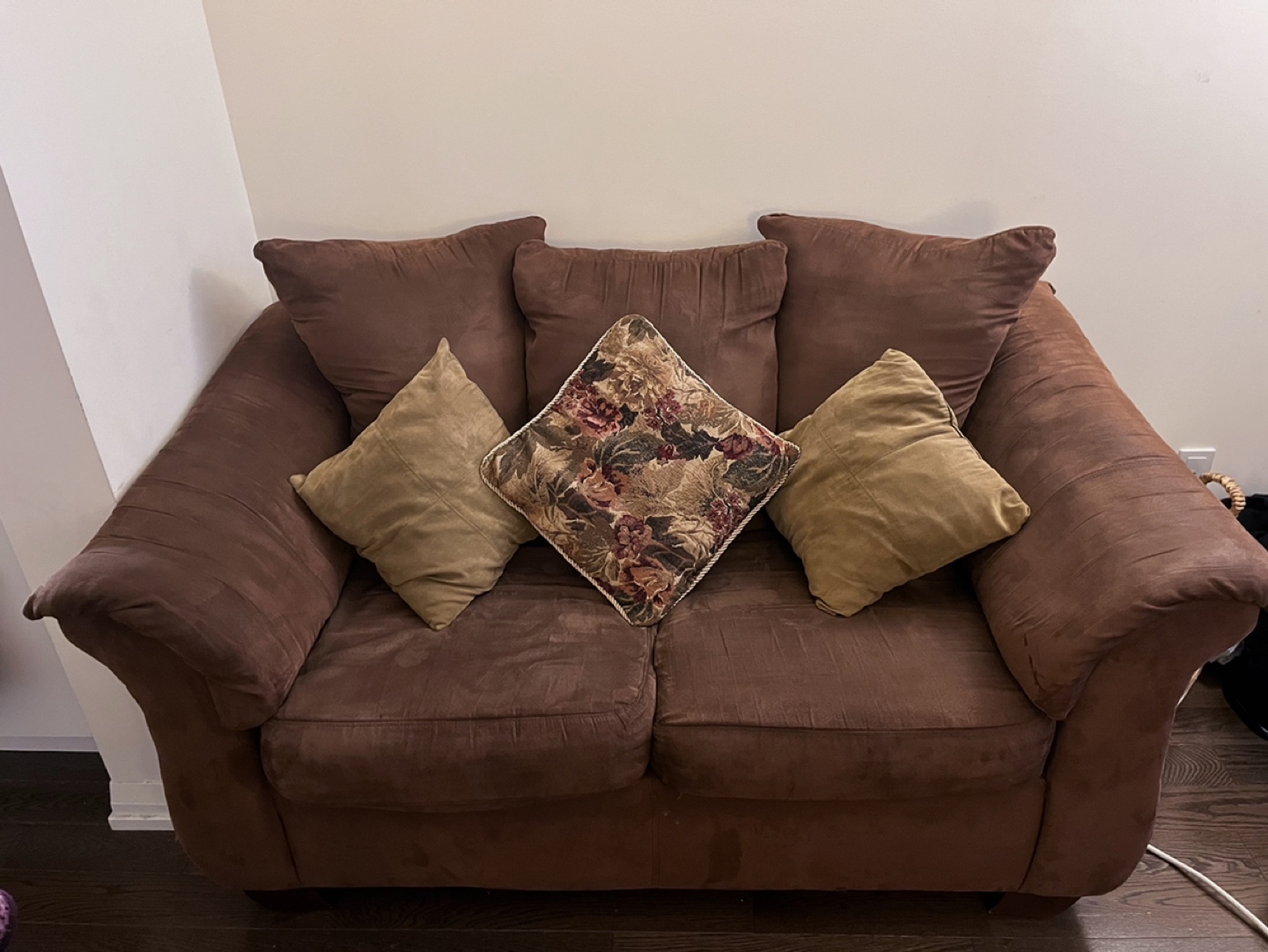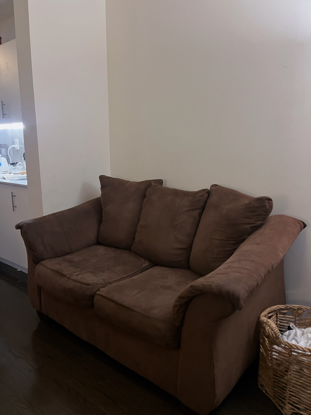 •Smoke free/Pet free/bug free/ regularly cleaned •Dimensions 90cmH x 170cmW x 93cmD •Pick up only downtown area, King East An extremely soft couch for cozy nights❤️ Have been using this couch for 3 years and happy with it! However, selling due to moving. Goes well with dark furniture. Amazing for small spaces and a couple. Two bottom cushions are removable. Three back cushions are sawn. Has four small removable legs. The dimensions are including the height of the legs.