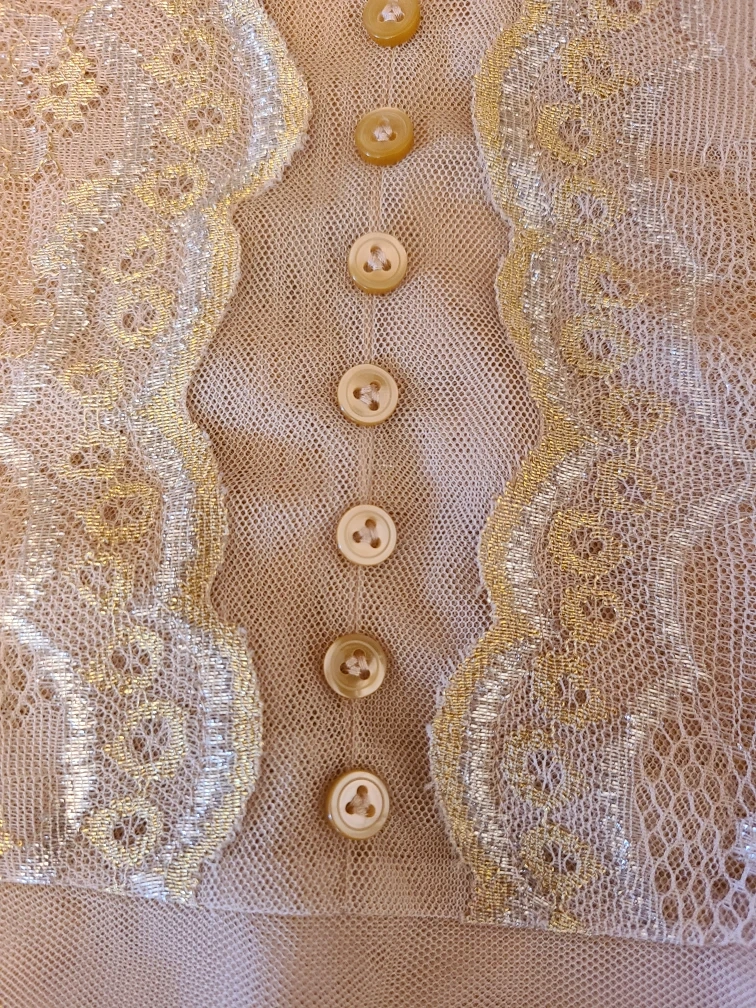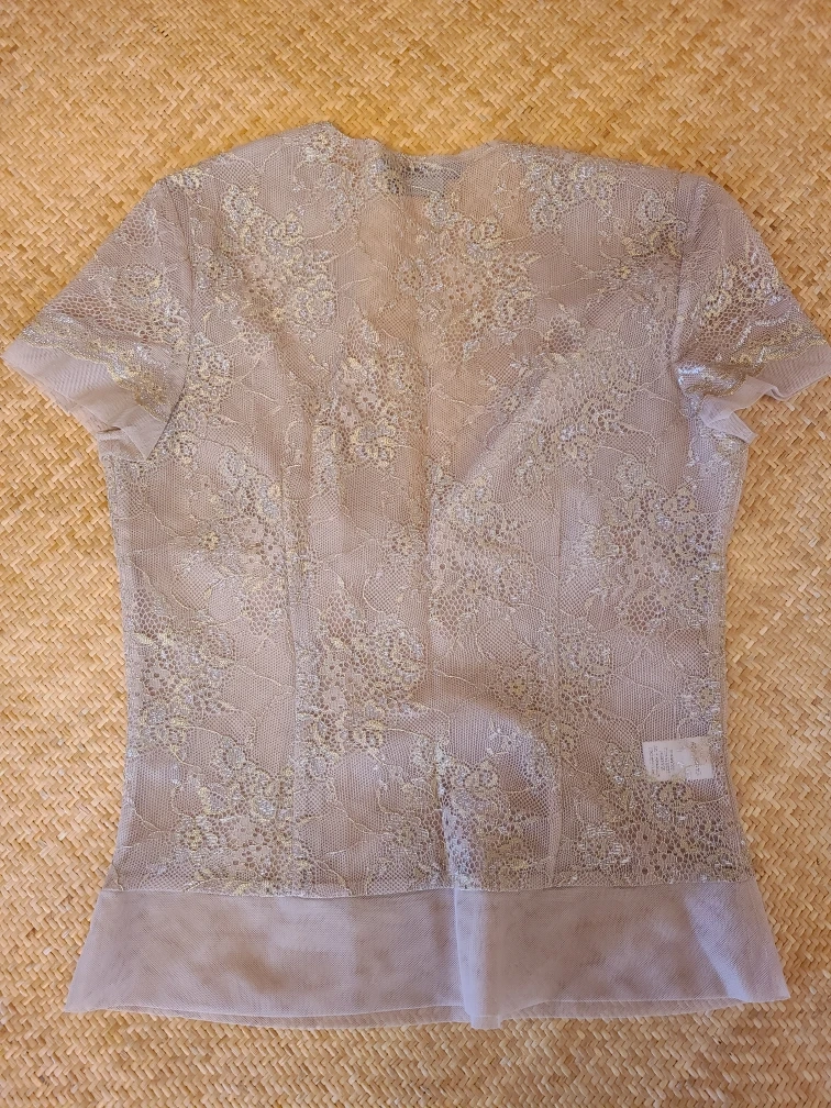 BCBG short sleeve blouse 🤎 Mesh with gold & silver specks (flower designs) 🤎 V-neckline 🤎 Buttons at the front 🤎 Sheer design I'm doing a closet clean out and hope this will be valuable to a new owner!! its super cute and look at that intricate lace design