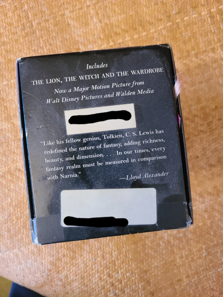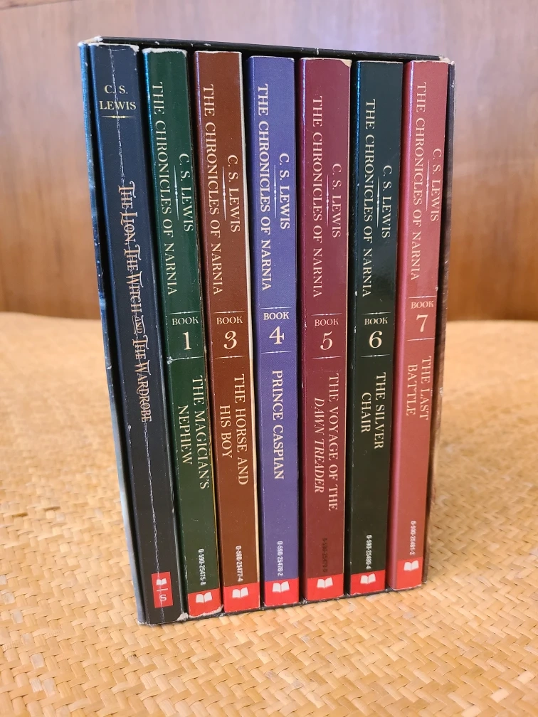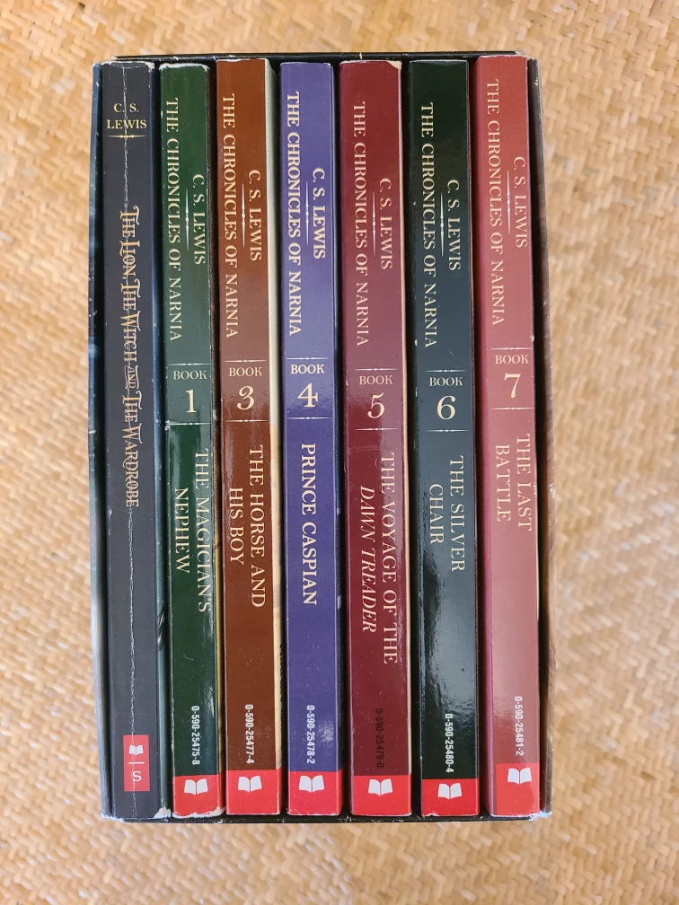 ๐ 7 books from The Chronicles of Narnia ๐ Good Condition ๐ In box set ๐ Great for elementary school reading The top of the box set does have sticky labels with a name on it. I'll try to remove it or cover it up.