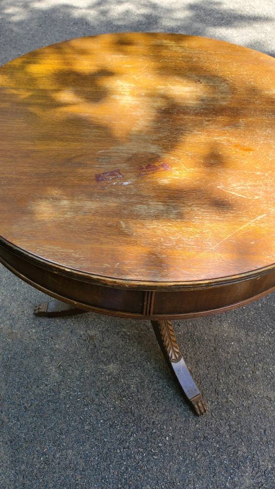Small round table with a drawer. Needs a little TLC, or cover with a doile. If ad is still up, it's available! No delivery! Pickup Midtown Toronto Yonge and Eglinton area Selling for a relative