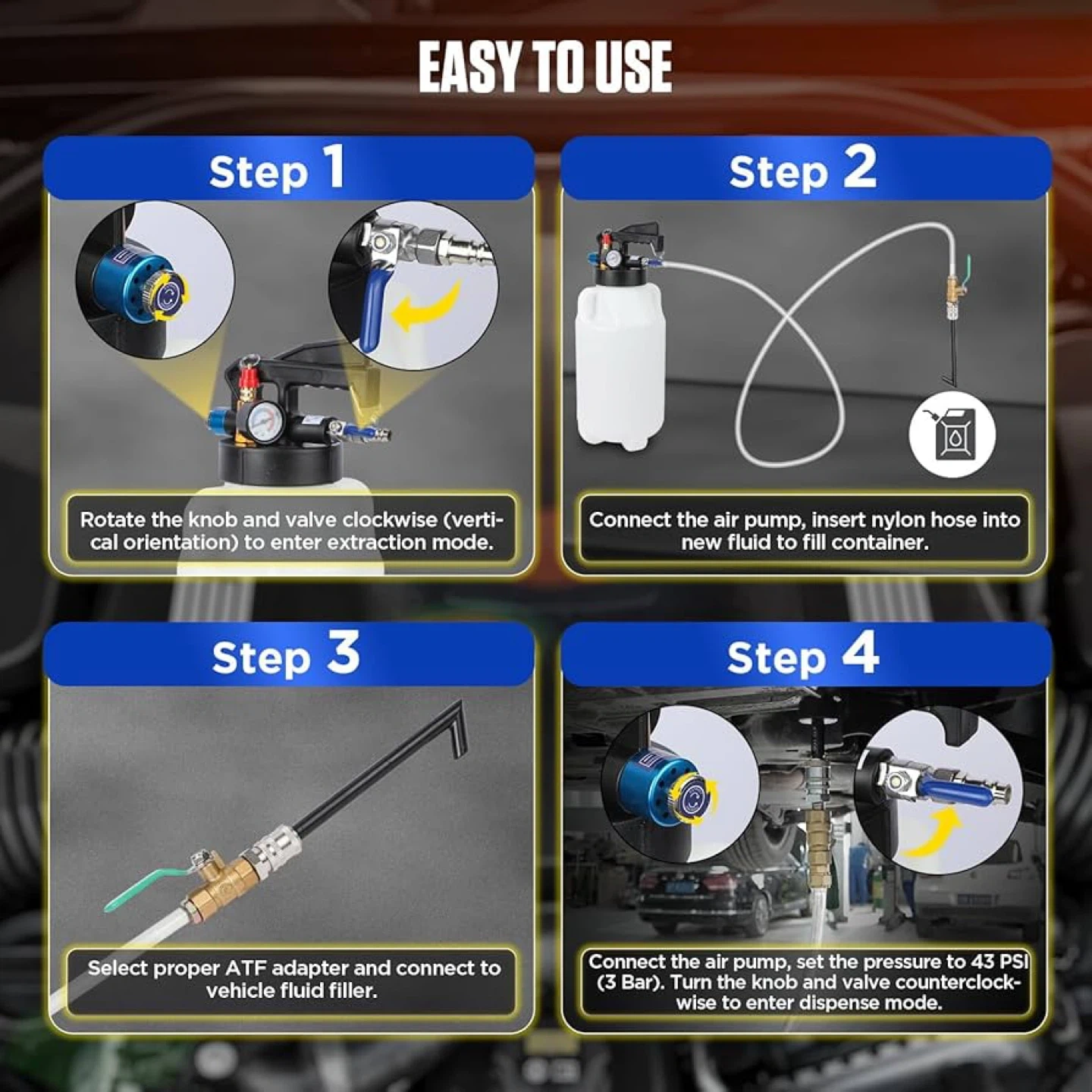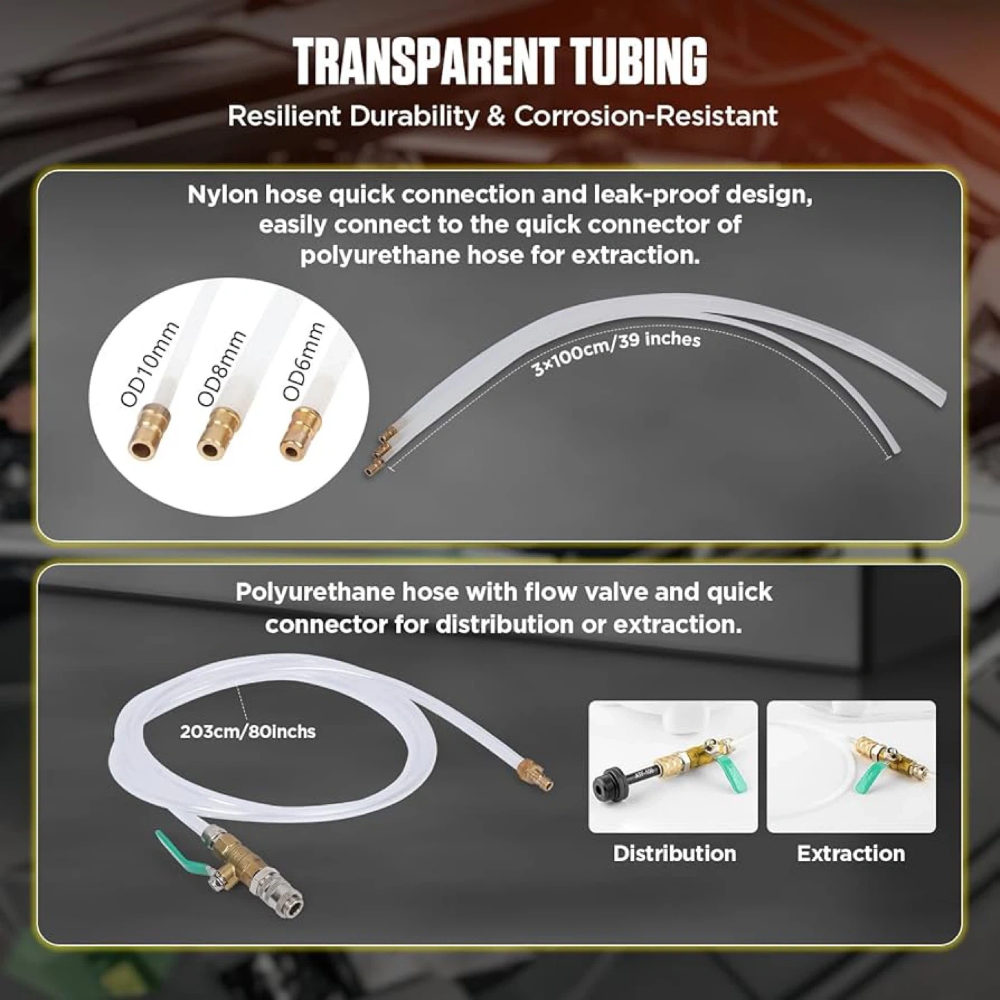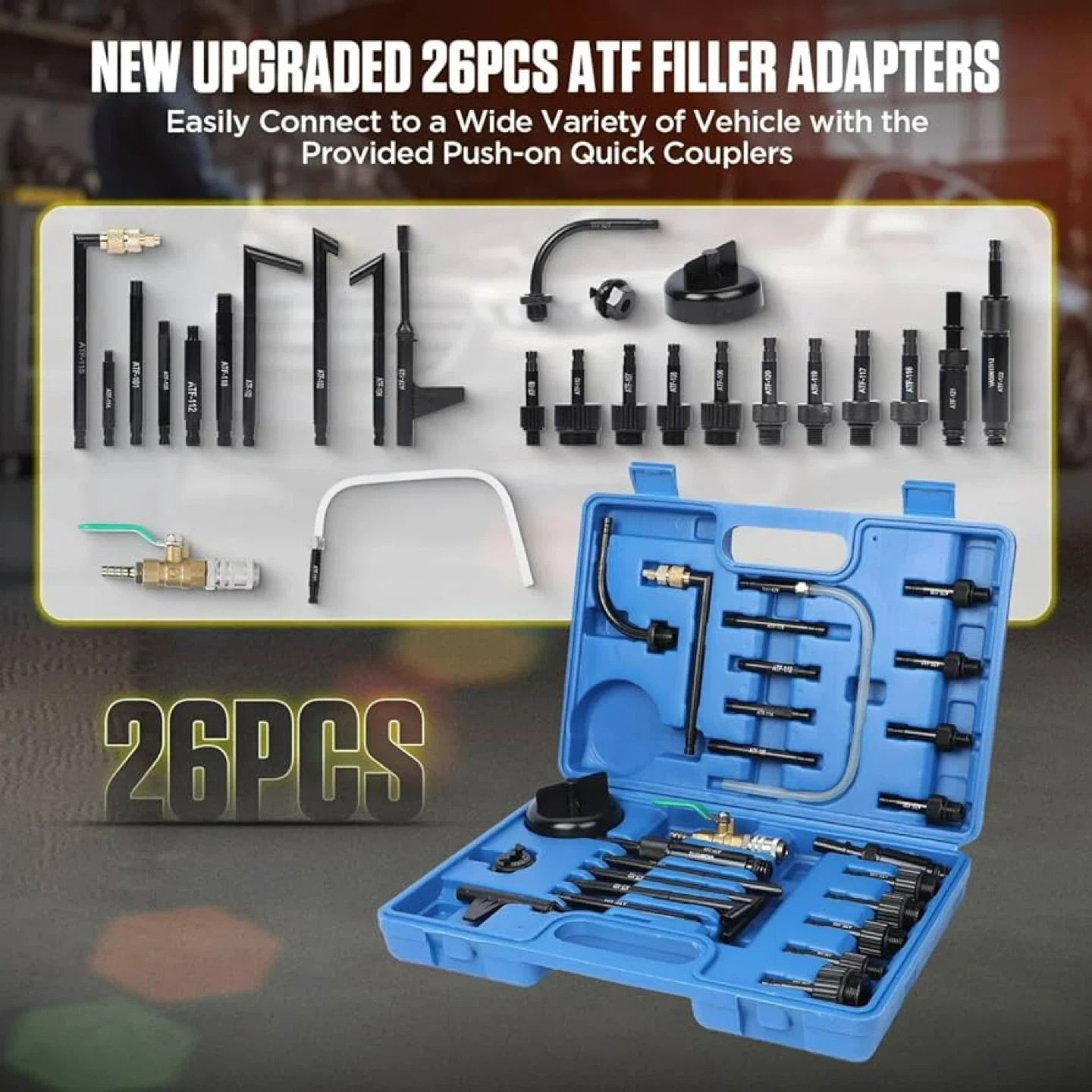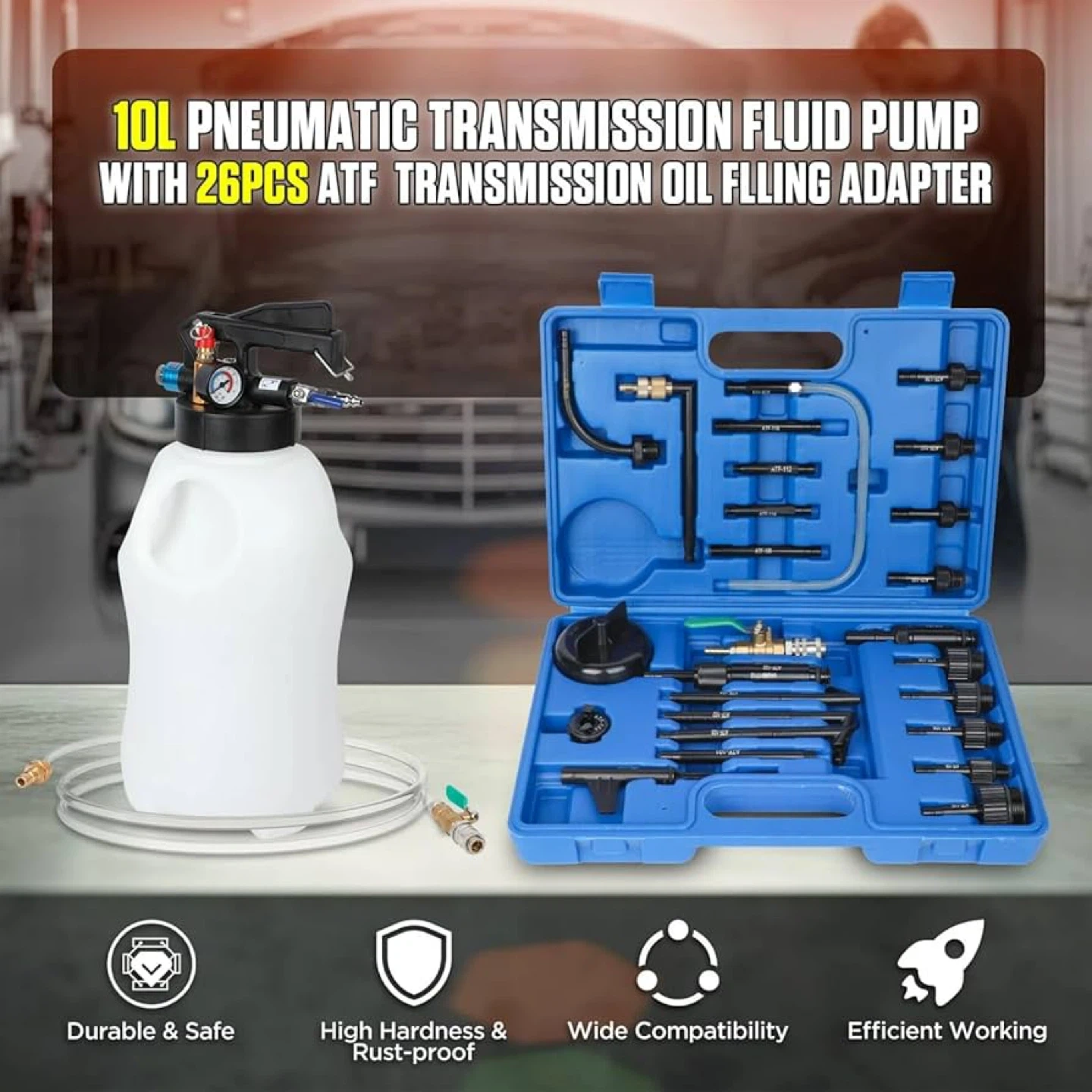 Selling an 8L transmission fluid pump that comes with 26 ATF transmission oil filling adapters. It features reliable wear, heat, and chemical resistance. It also has: - Flow control valve - Releasing valve - Pressure gauge - Extrac/dispense knob The set includes transparent tubing that is resilient, durable, and corrosion-resistant, with a nylon hose quick connection and leak-proof design.
