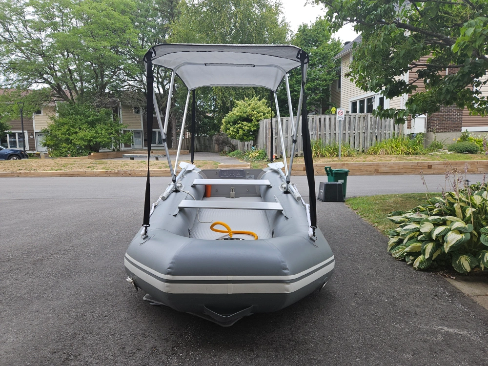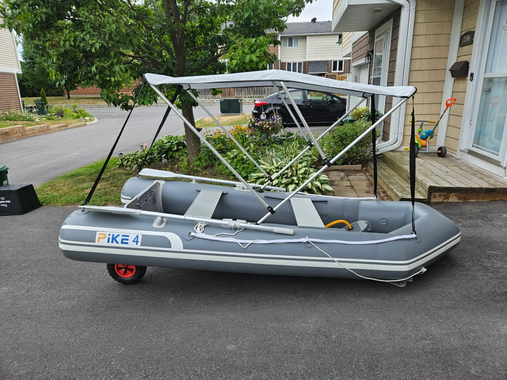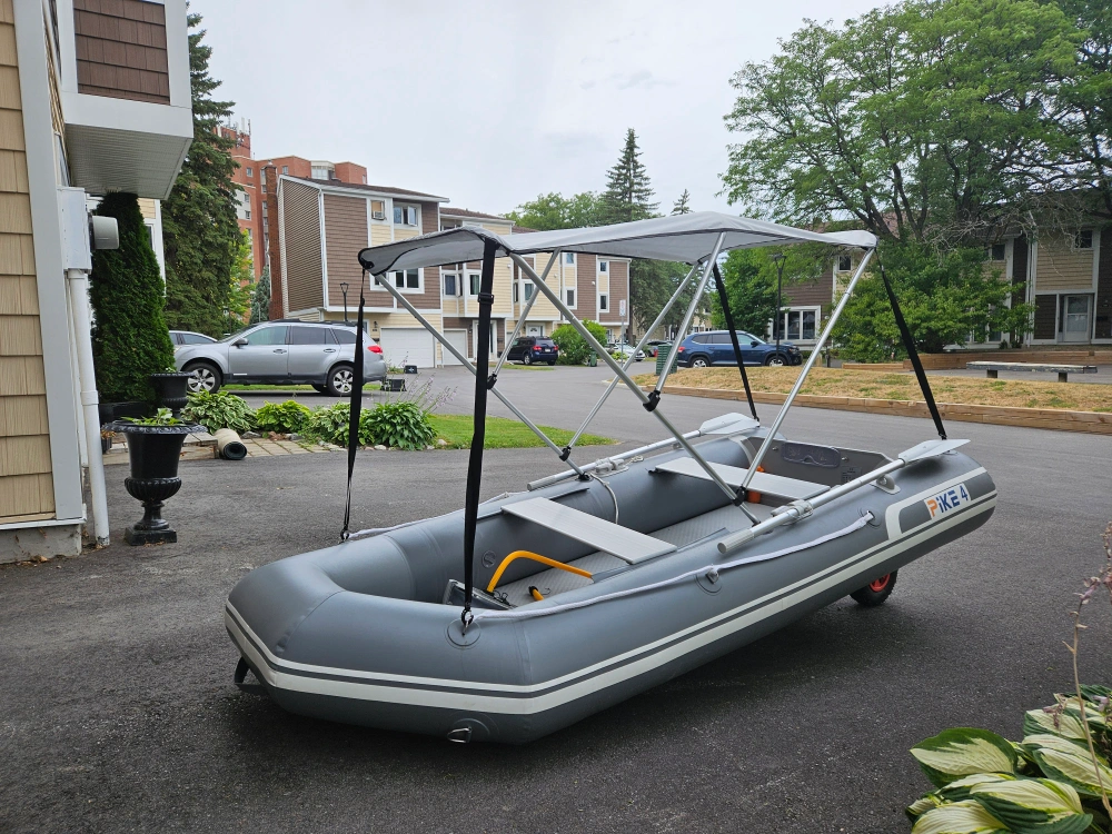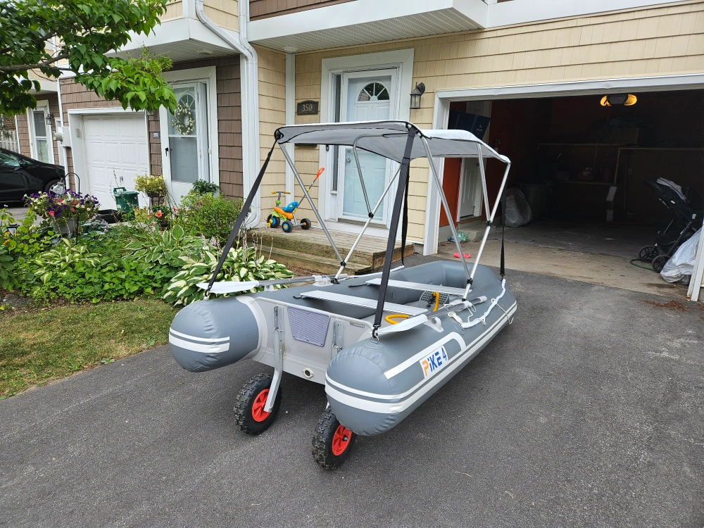 High quality inflatable zodiac with 2 launch wheels installed on the transom, 2 aluminum seats, 2 aluminum paddles, air base, rescue kit, ropes, repair kit, cover, storage bag, foot pump, and sunshade. Can take up to 10HP outboard motor. Barely used, box still available. Item is available as long as the ad is listed.