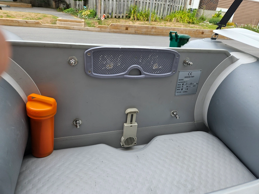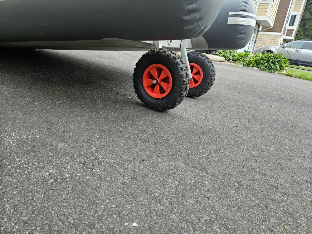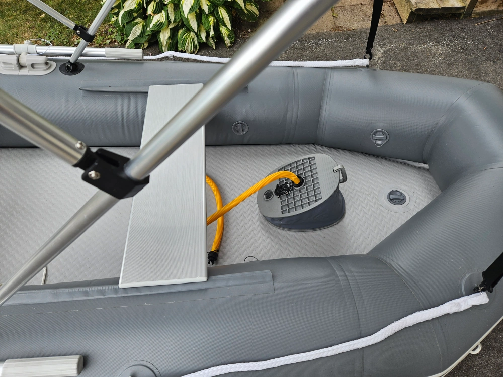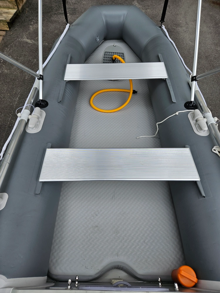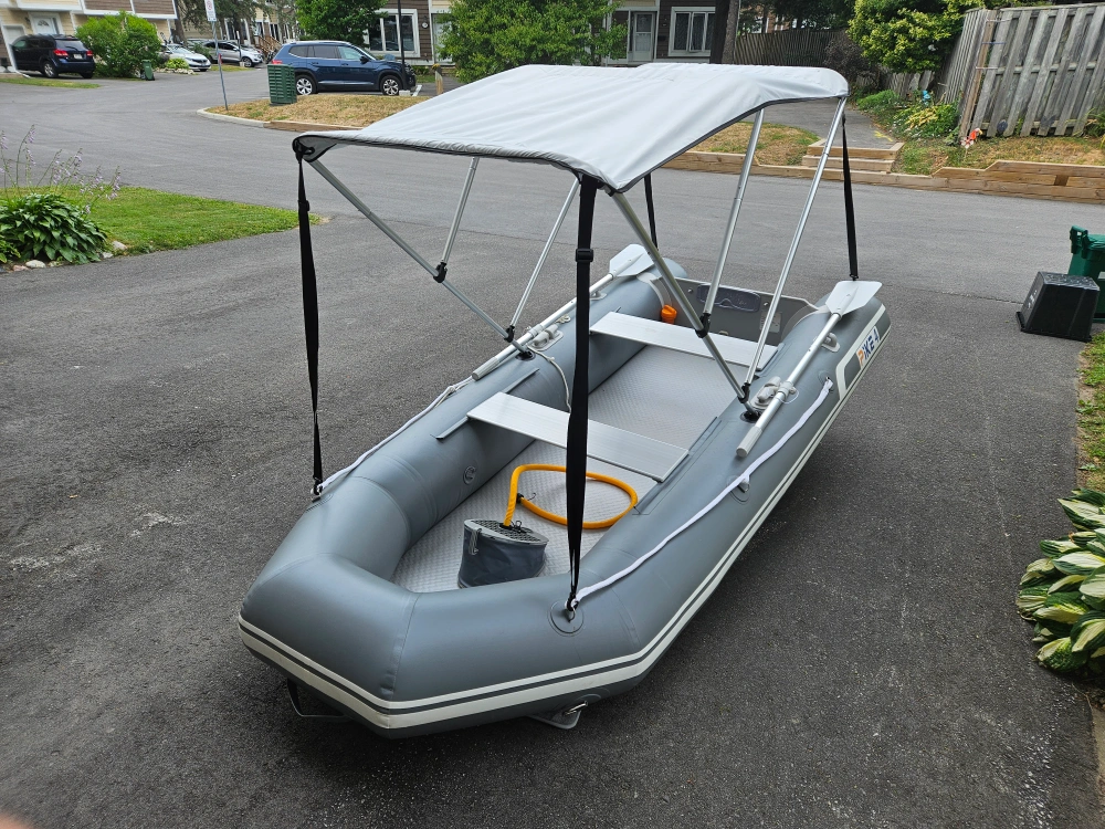 High quality inflatable zodiac with 2 launch wheels installed on the transom, 2 aluminum seats, 2 aluminum paddles, air base, rescue kit, ropes, repair kit, cover, storage bag, foot pump, and sunshade. Can take up to 10HP outboard motor. Barely used, box still available. Item is available as long as the ad is listed.
