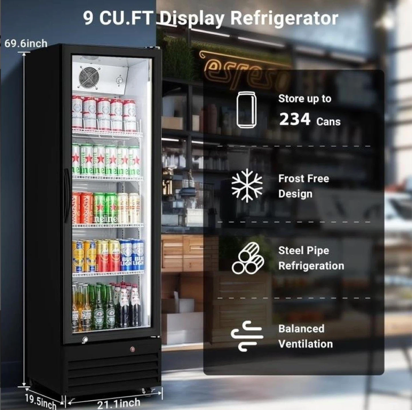 Selling a 9 CU.FT Display Refrigerator! It's designed to store up to 234 cans, and features a frost-free design with steel pipe refrigeration and balanced ventilation. The dimensions are approximately 69.6 inches in height, 21.1 inches in width, and 19.5 inches in depth. It is brand new and sealed. Original price- 110+tax