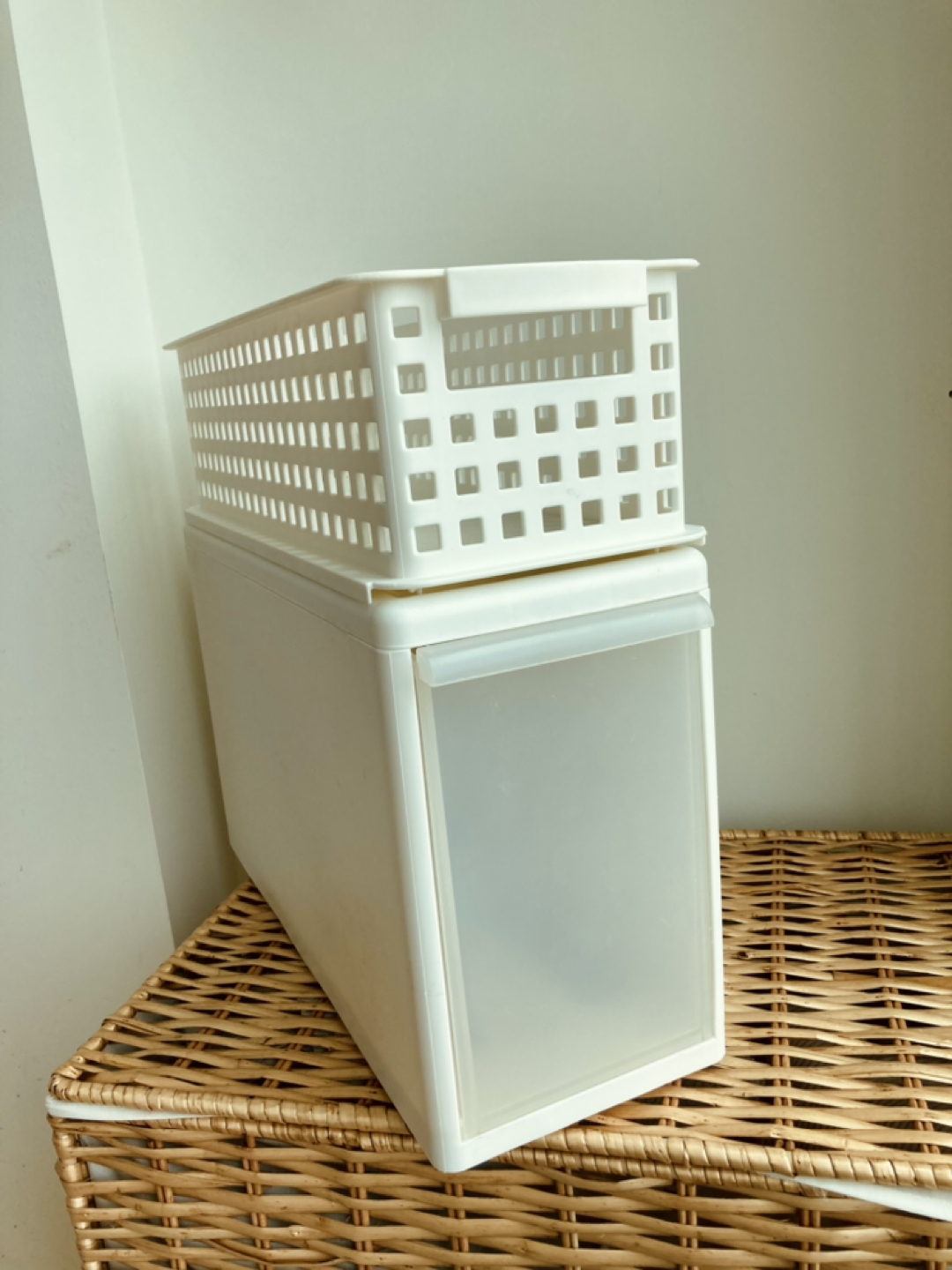 18.25 x 6.75 x 10.75 inches The basket fits snugly on top and is 5” tall. It’s a sturdy drawer perfectly for store anything tall that needs storing. We used it for extra shampoo bottles and sunscreen, but it just doesn’t work for us anymore.