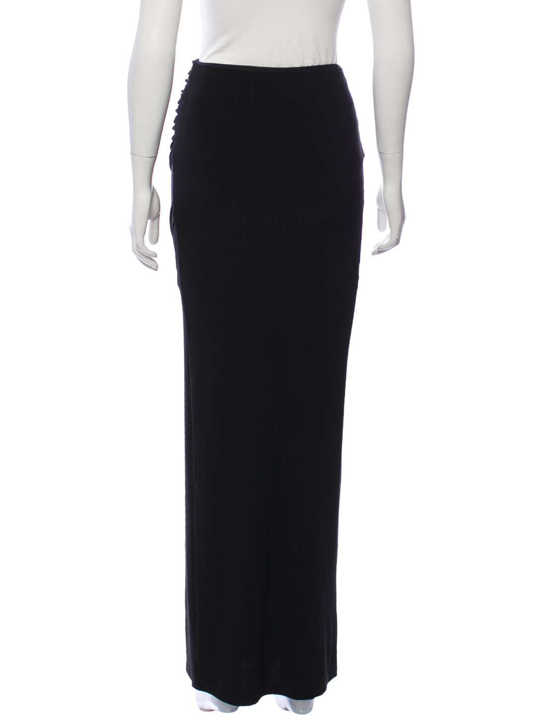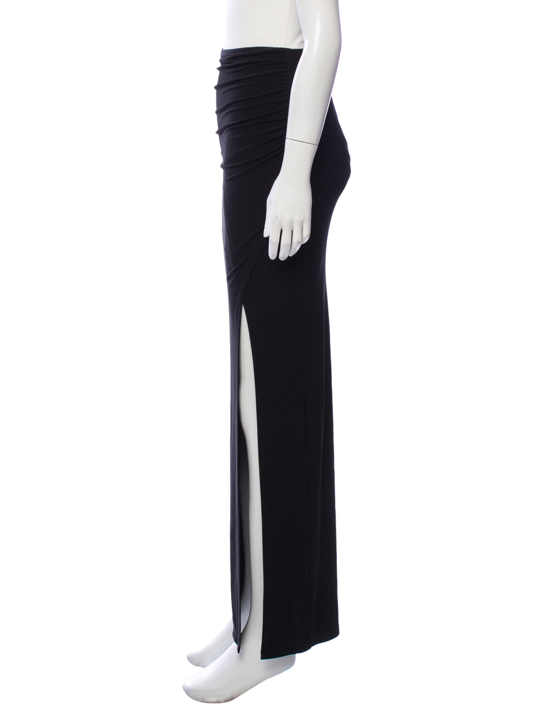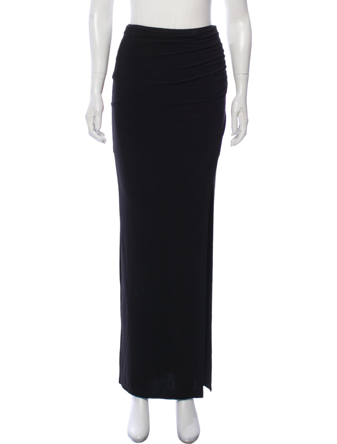 Black Alice + Olivia maxi skirt with slit at hem, tonal stitching at front, ruched at side waist and elasticized waistband. DETAILS Waist: 24" Hip: 30" Length: 43" Fabric: 99% Polyester, 1% Elastane Condition: Excellent. No visible signs of wear. Only worn a couple of times. Offers welcome! Further discounts given if bundling multiple items. Pickup at Burnhamthorpe and East Mall.