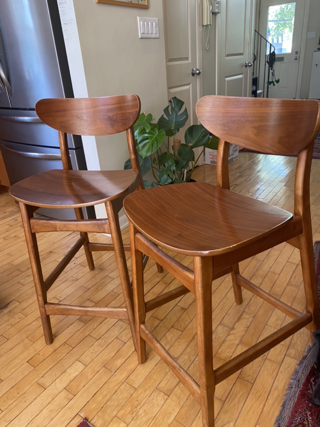 Bought these walnut counter stools from West Elm exactly a year ago and although they give a great MCM vibe, we’ve opted for something else so these are up for grabs! Excellent used condition given they’ve been our only seating option in the kitchen for meals, TV, mail sorting, crafts, etc.. We paid $329 each and are asking $295 for the pair. They’re still sold at retail. What a deal! Pickup only. E-transfer or cash. Thanks!