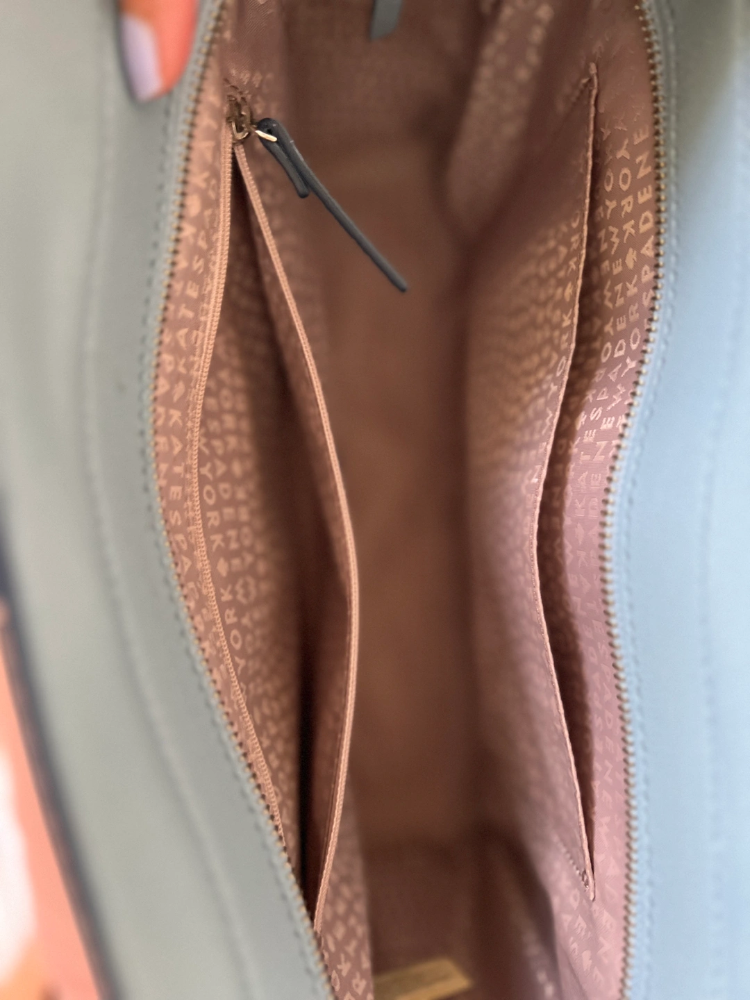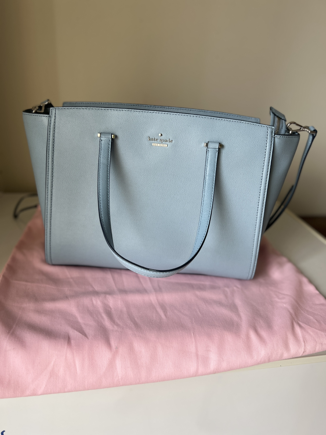 Brand new. Bought but never used. Baby blue/ sky blue colour, saffiano leather. Very spacious and sturdy. Been sitting in the dust bag in my closet. KATE SPADE tote (not outlet version). 16 inches length 10.5 inches high Adjustable strap and handles. Hits just below the hip if worn with the long handle. Paid over $300 for this. Pickup James Austin Drive or will meet at square one.