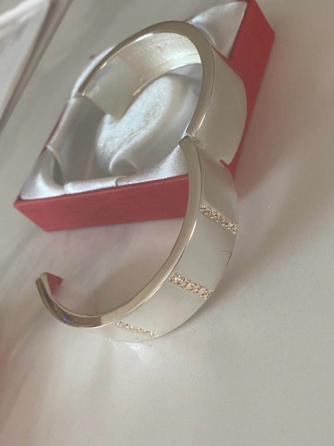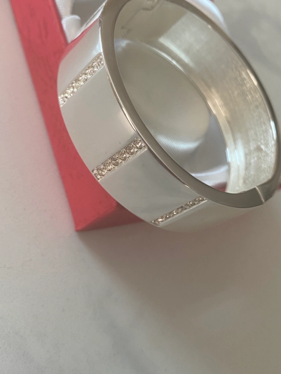 Here's a pretty solid 925 silver bangle bracelet! It has three rows of rhinestones for a bit of sparkle. It comes with its original box, making it perfect for gifting or safekeeping