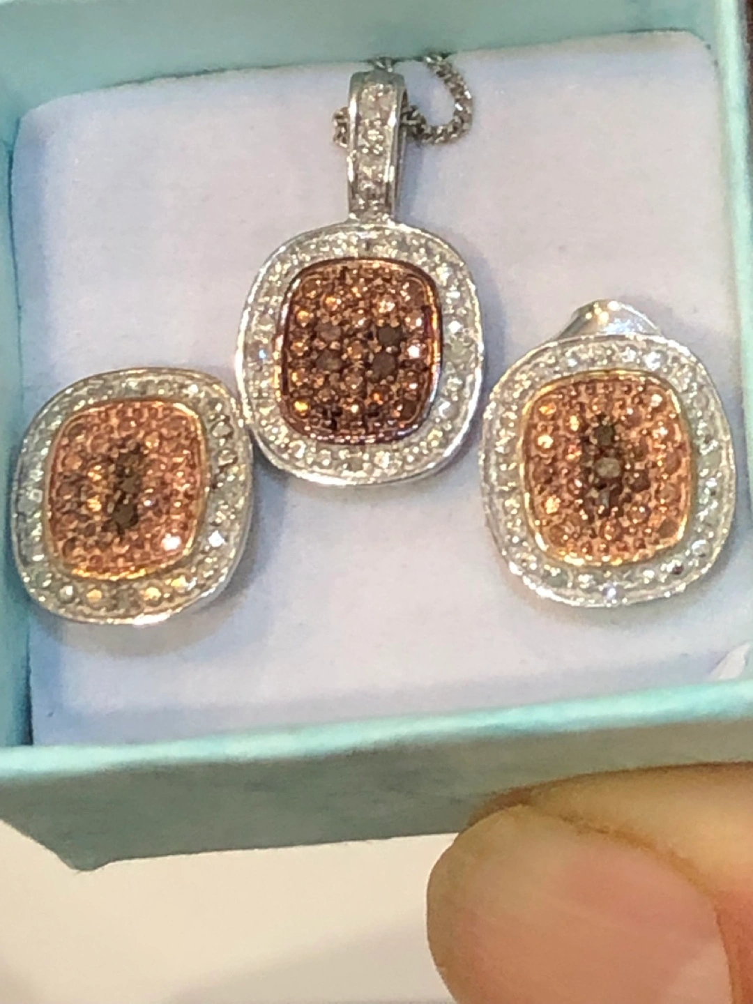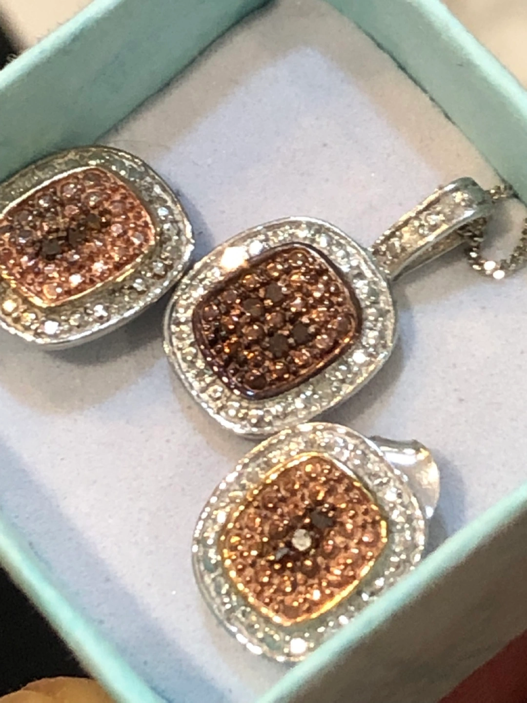 Selling a lovely set of 925 solid Sterling silver with a touch of rose, gold, authentic, red and white diamonds earrings and a pendant. They feature a square design . They come in a nice box, perfect for gifting or keeping them safe!