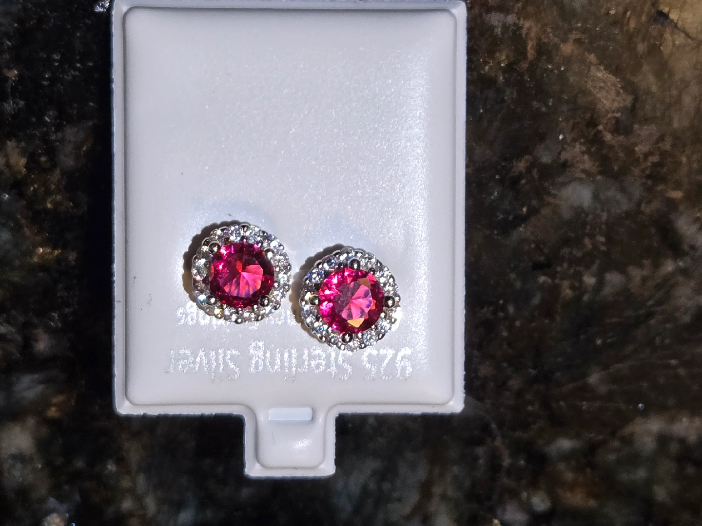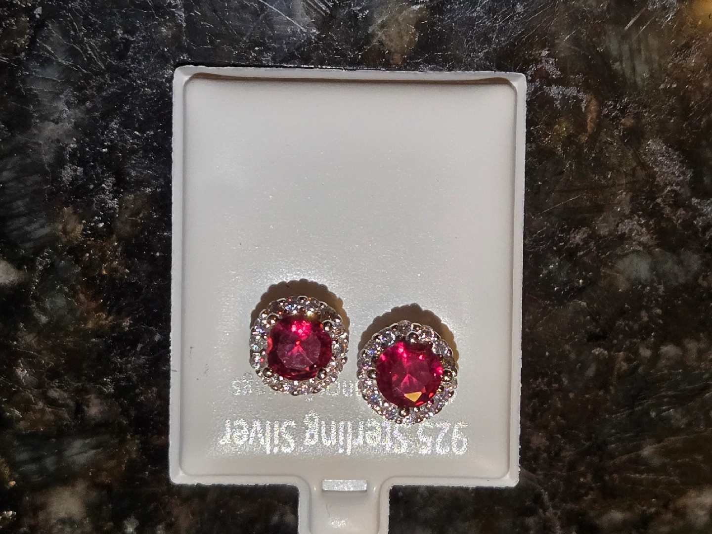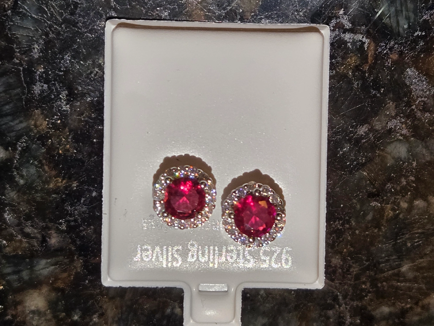 These are a pair of 925 Sterling Silver earrings featuring red stones surrounded by smaller clear stones. They are in excellent condition and ready to add a touch of sparkle to your look!