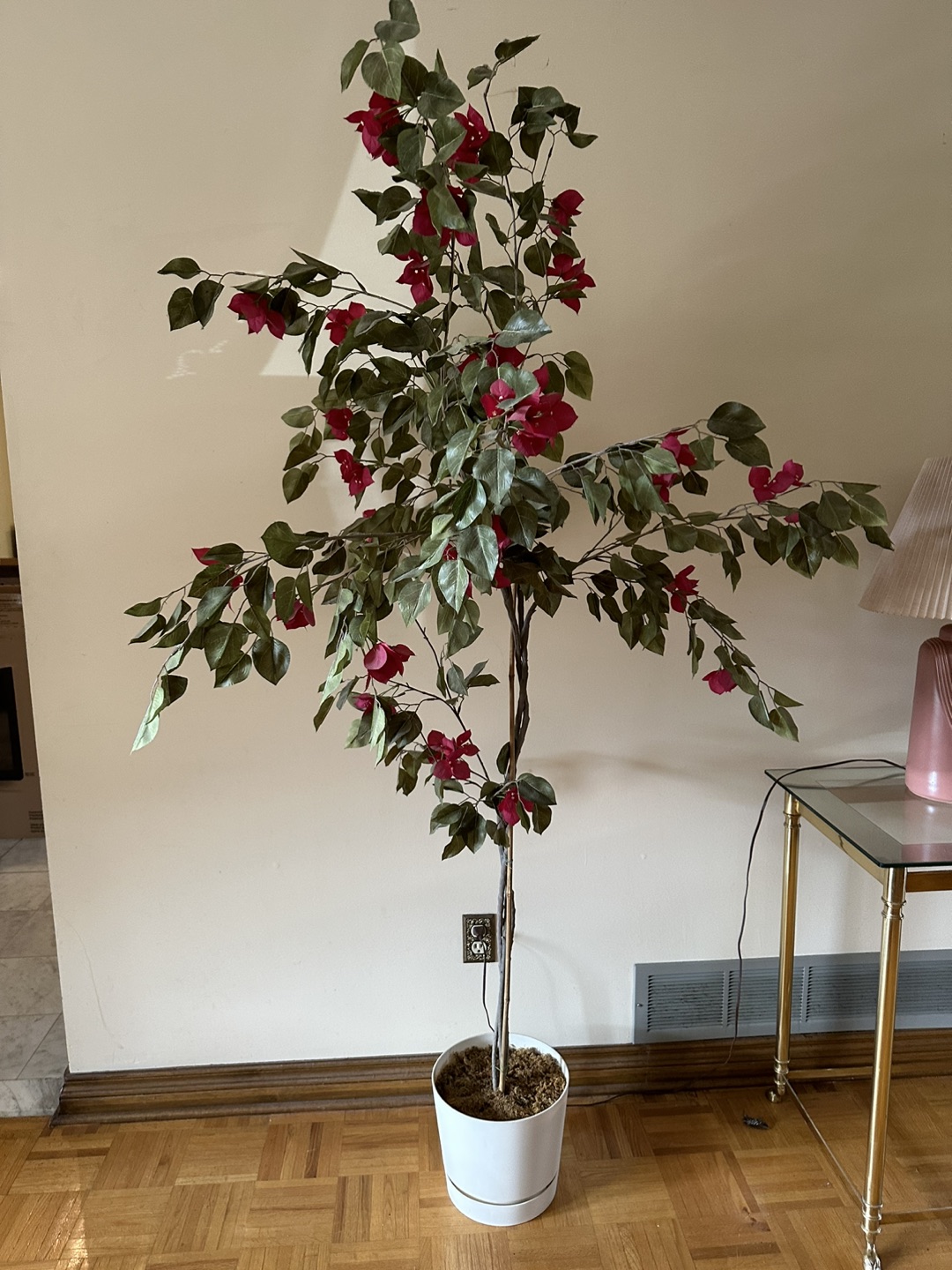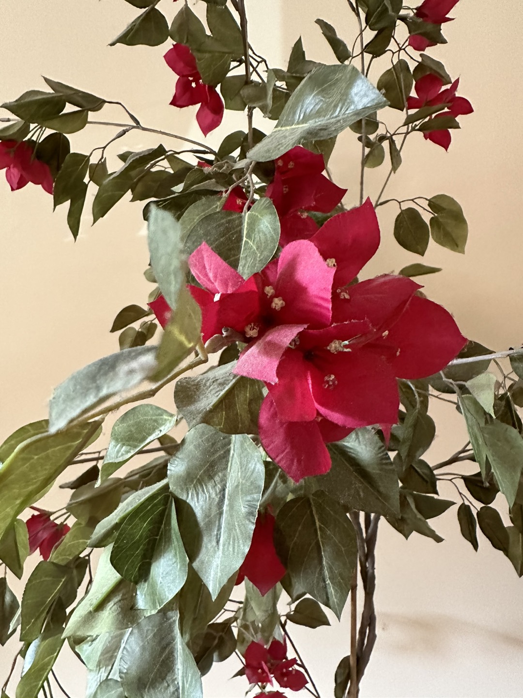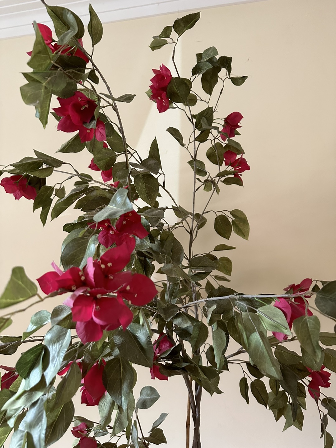 Artificial Red Flowers and Green Leaves Tree in White Pot Tags: floral indoor decor, indoor accent, tall indoor tree, fake indoor tree, tall artificial plant tree