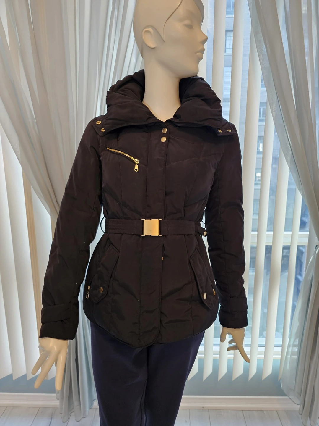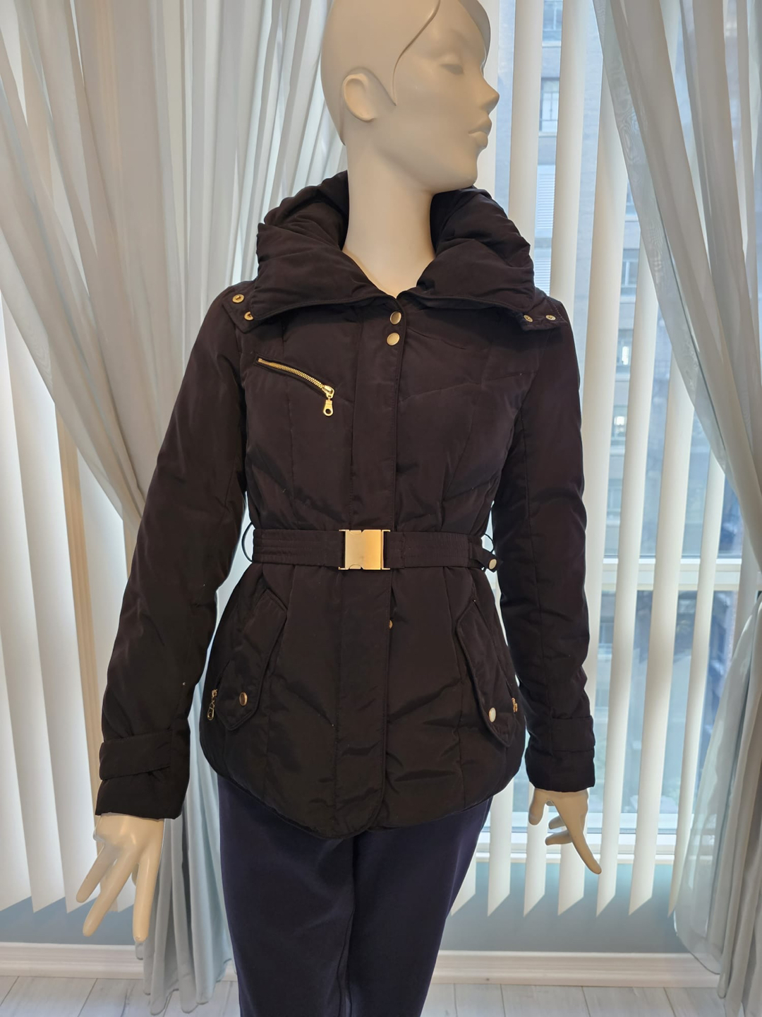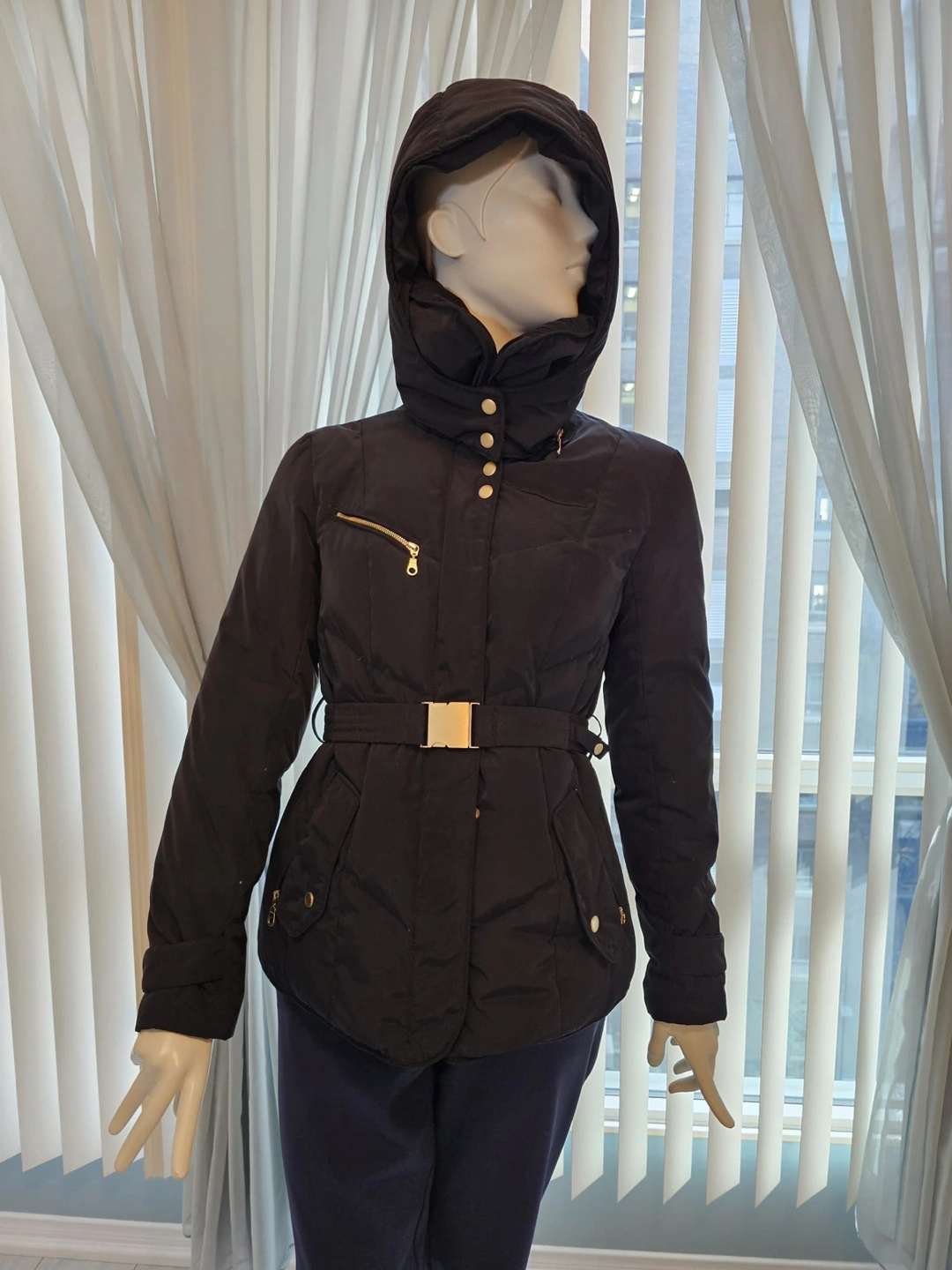 A cozy, yet stylish form-fitting hooded coat Gold accents Belt Double collar Concealed front zipper On-seam pockets Hood