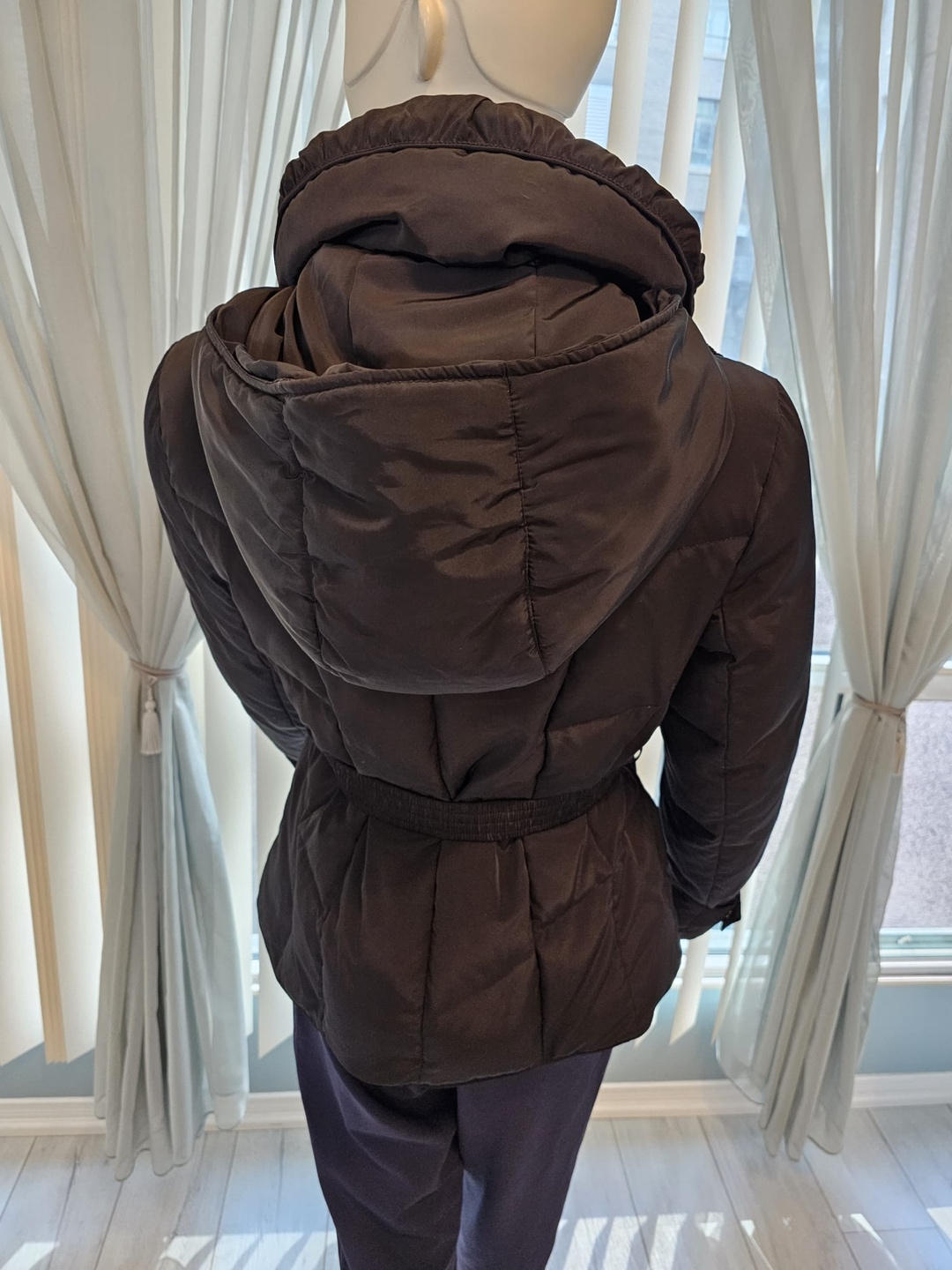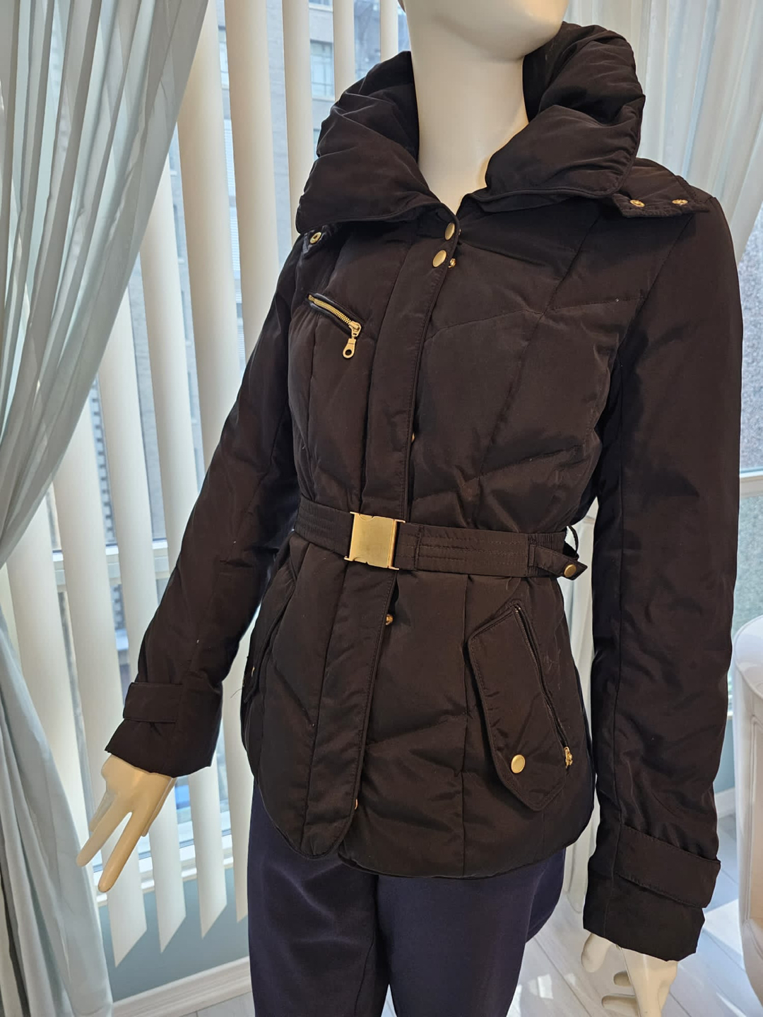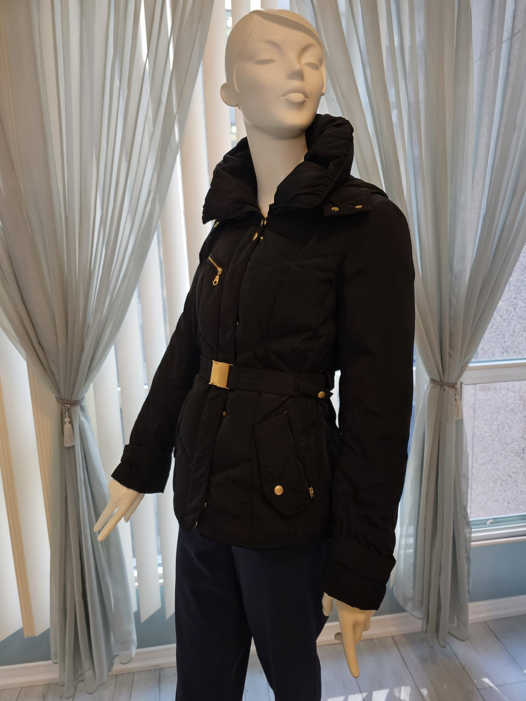 A cozy, yet stylish form-fitting hooded coat Gold accents Belt Double collar Concealed front zipper On-seam pockets Hood