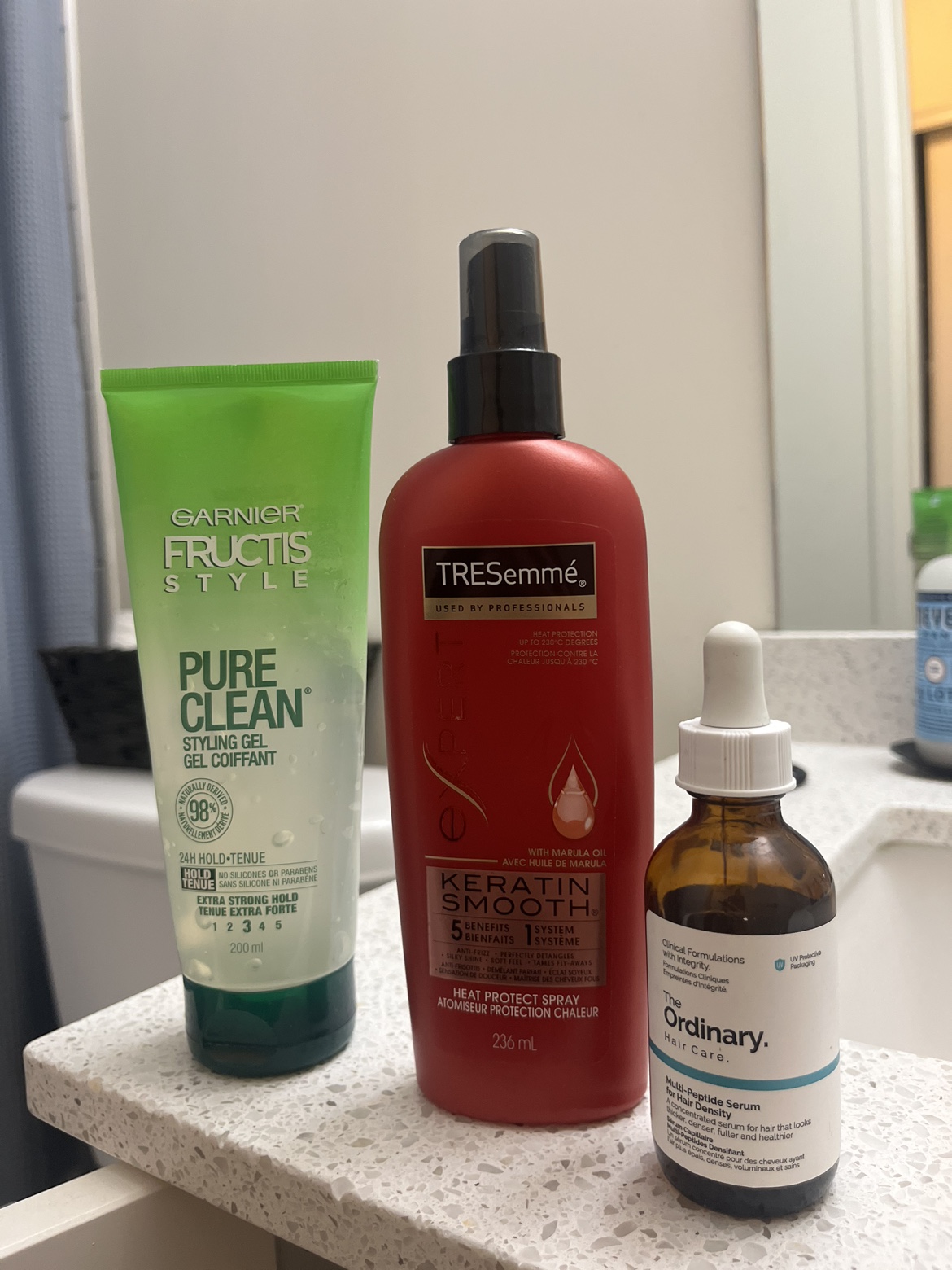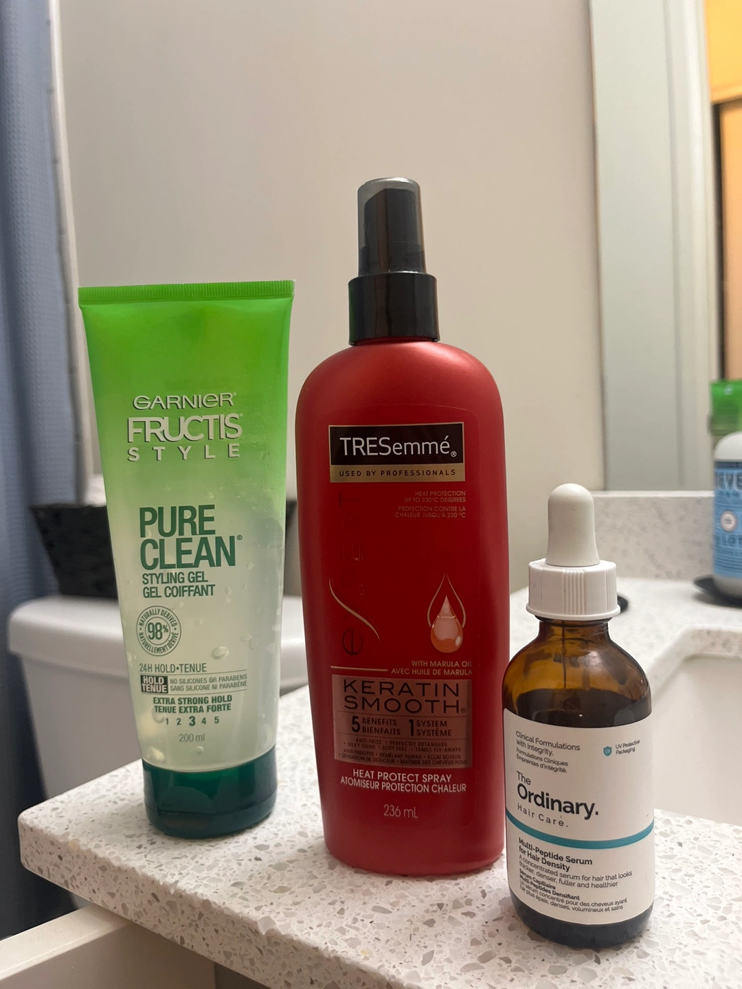 Styling gel is 90% full Tresemme heat protector is 50% full The ordinary hair serum 70% full Pick up asap please, moving in a couple days😊 (to another city, can’t bring too many bottles)