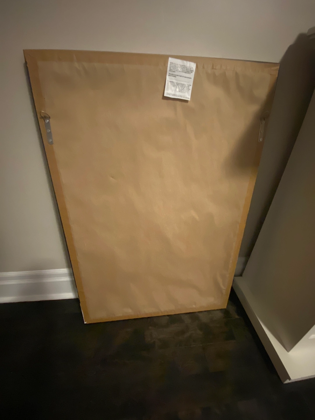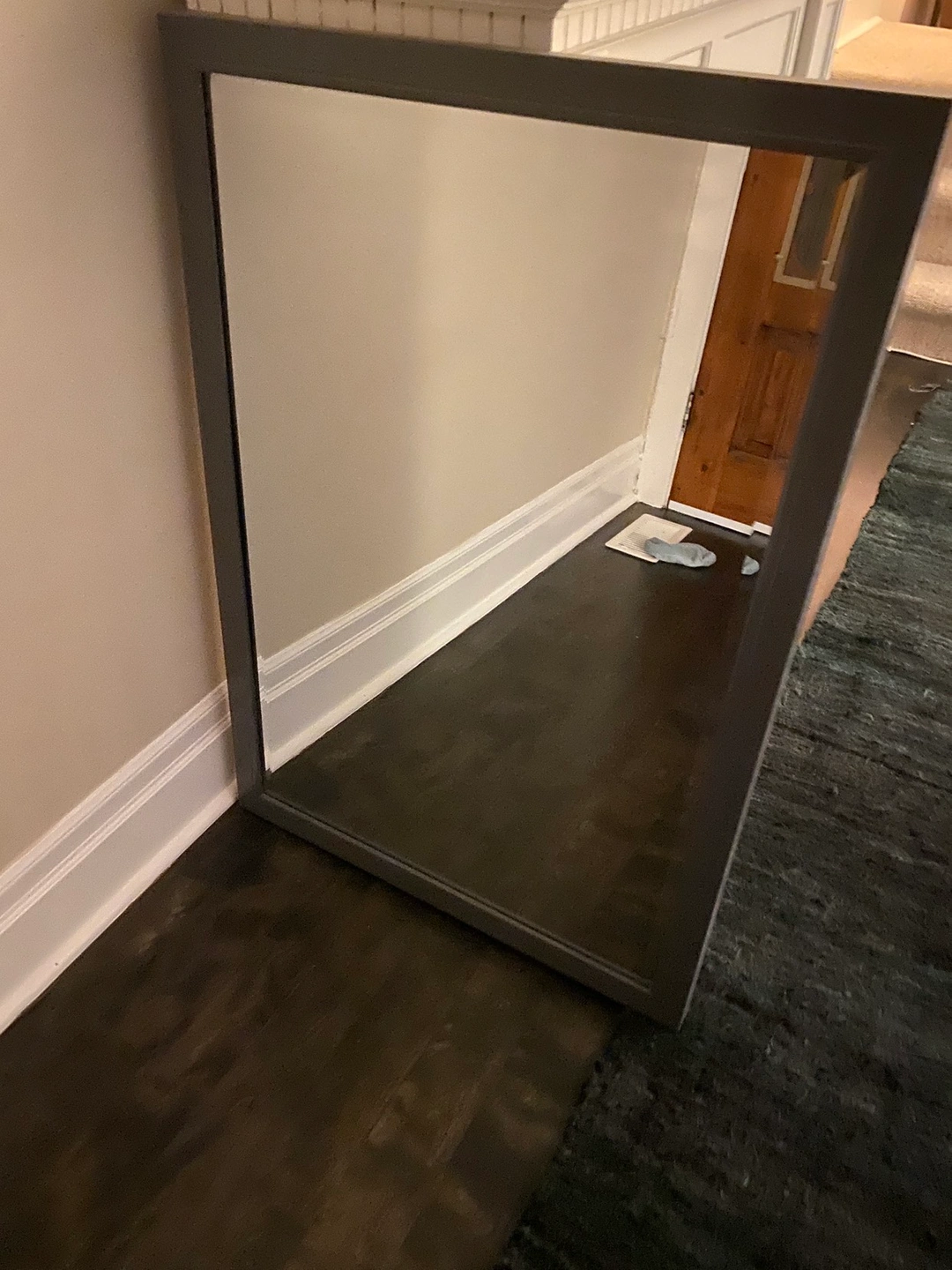Large mirror approximately 27”W x 39”H, with grey frame.