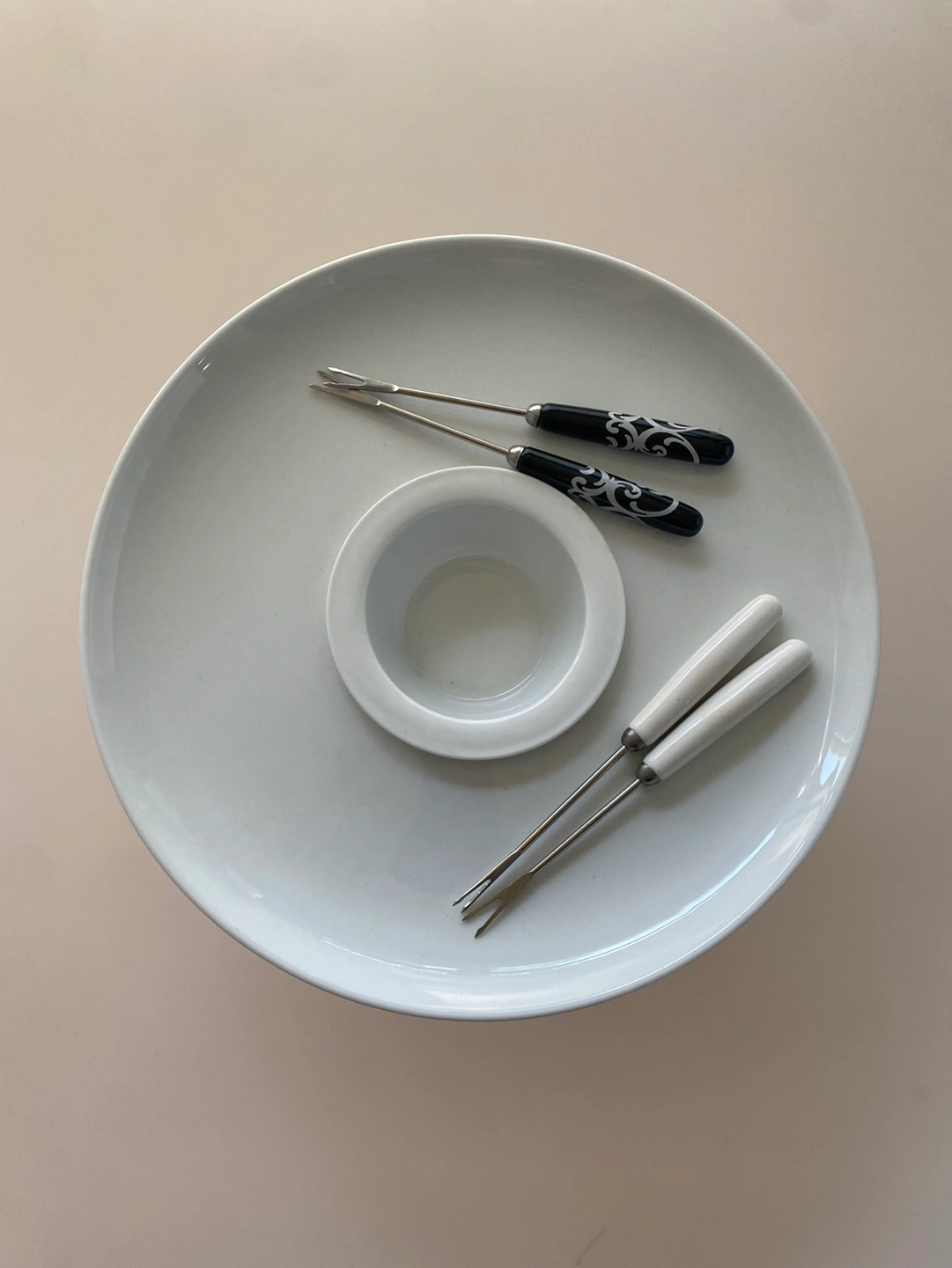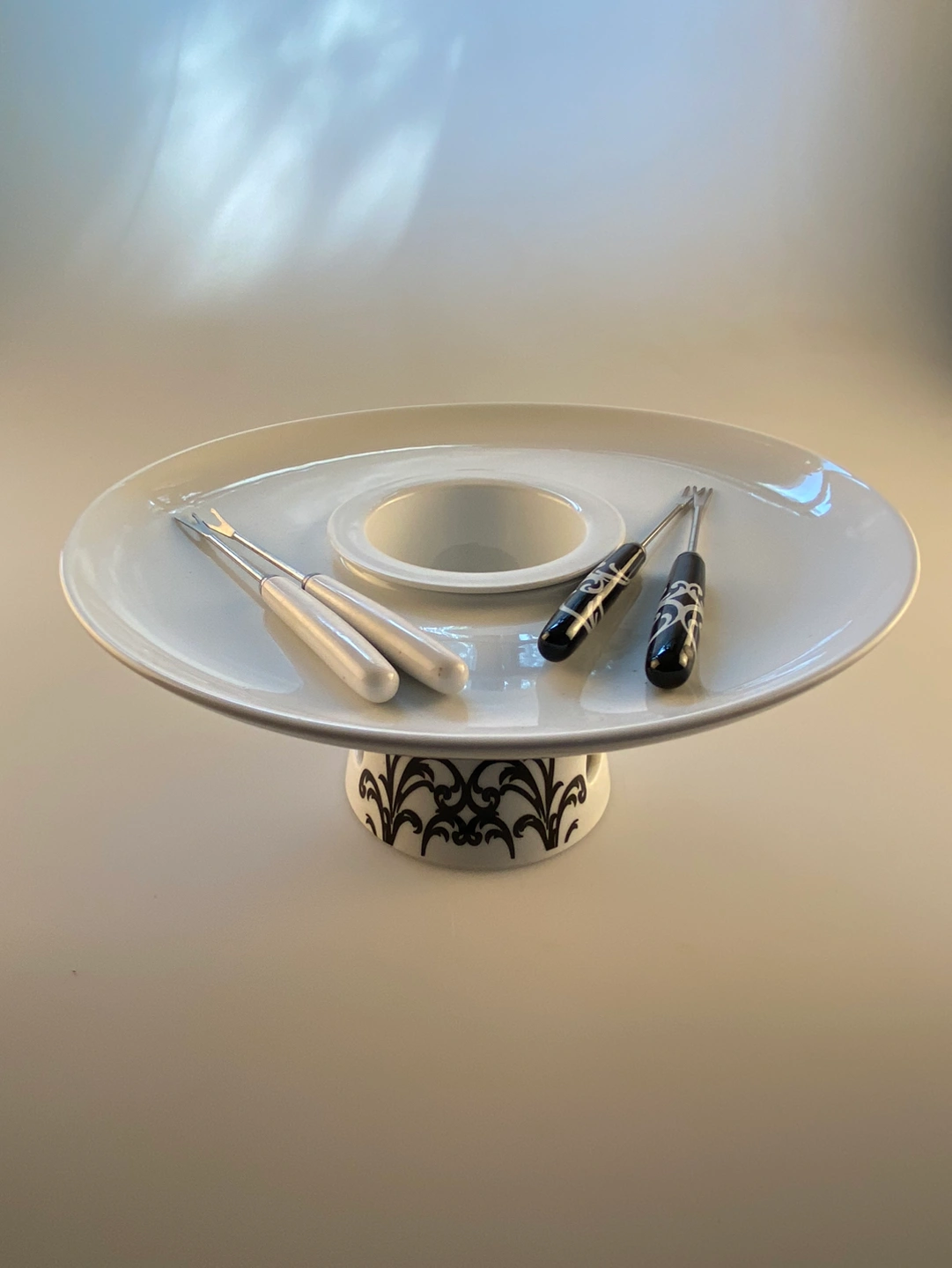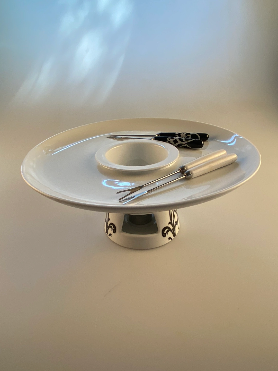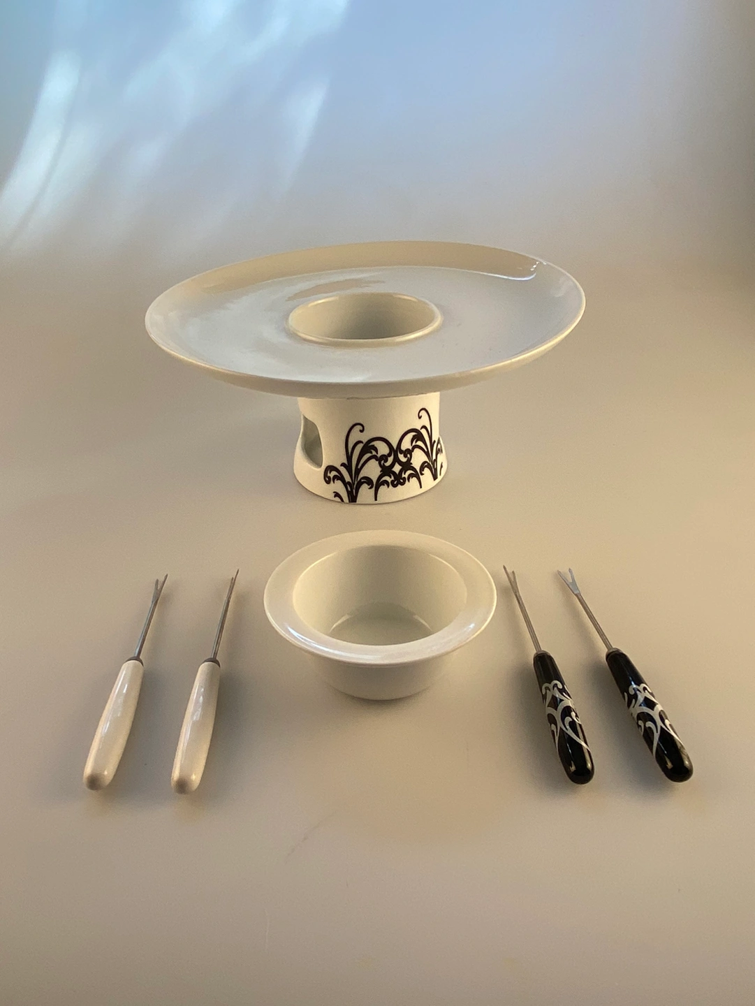 Rare new white & black pedestal fondue set from Wildly Delicious. Comes with 4 fondue forks and a removable bowl. Keep you fondue warm with a lit candle under the base. The top of the stand diameter is around 11.5”, the bottom of the stand diameter is around 4.75”. The bowl insert measures 4.5” at the top, 2.5” at the bottom, and is around 2” deep. Has a tiny wobble. I believe it’s ceramic, but it could be porcelain. The original box is missing, but I can wrap it in a box if you’d like.