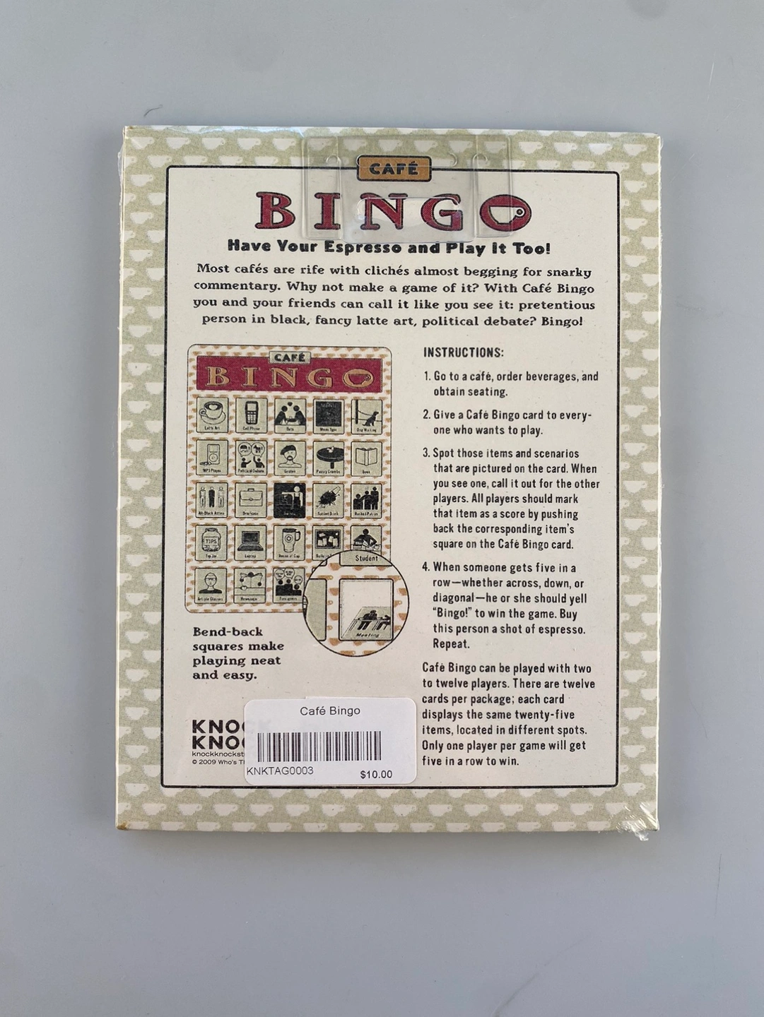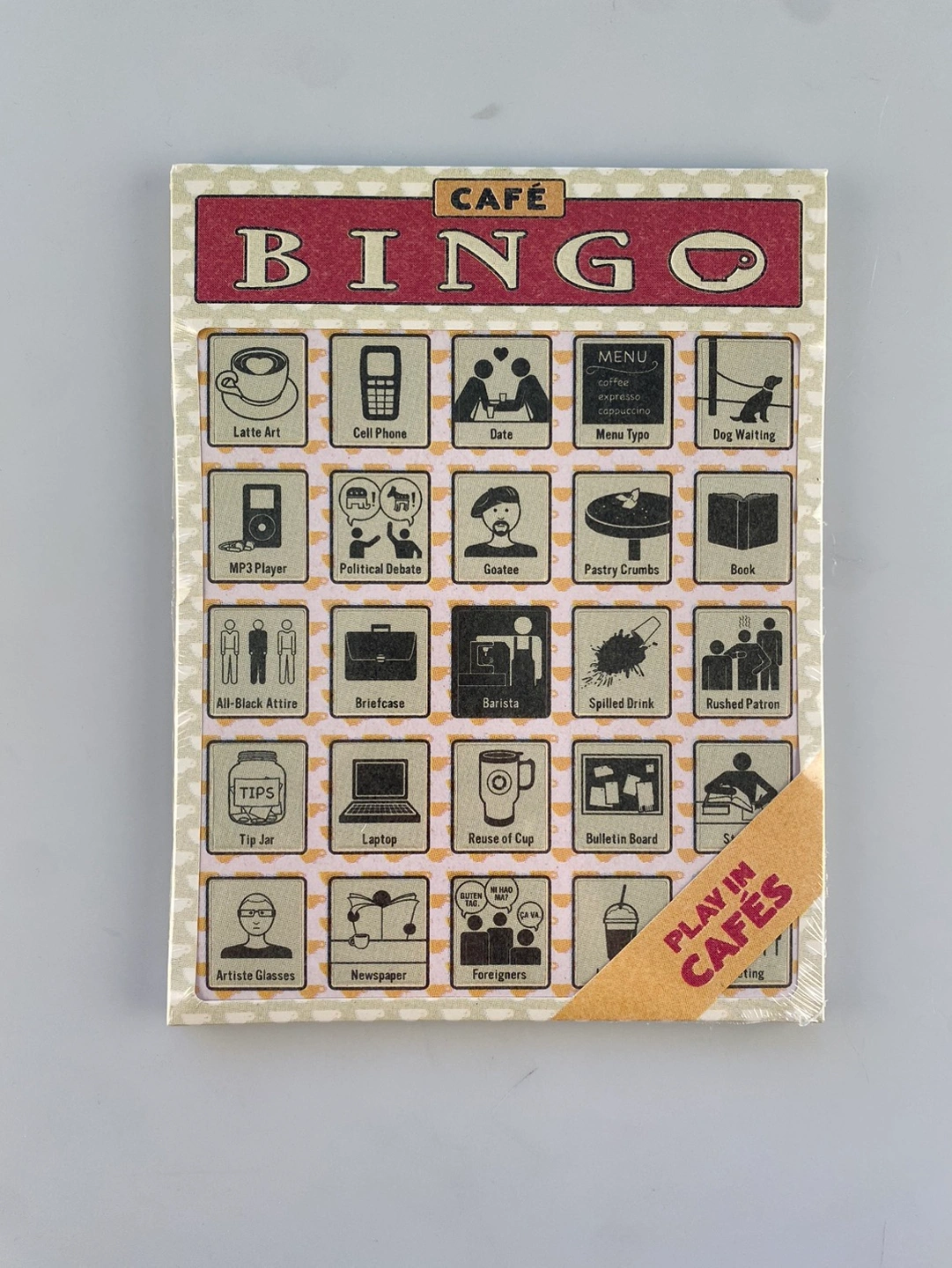 BINGO! Next time you’re hanging out with you friends in a coffee shop, have some extra fun with Cafe Bingo. Who will be the first to get 1 line , 2 lines or a full card? Comes with 12 identical paper cards so that you can play with 2 player or more. Made by Knock Knock, these paper Bingo cards are approximately 8.5” x 6.25”.