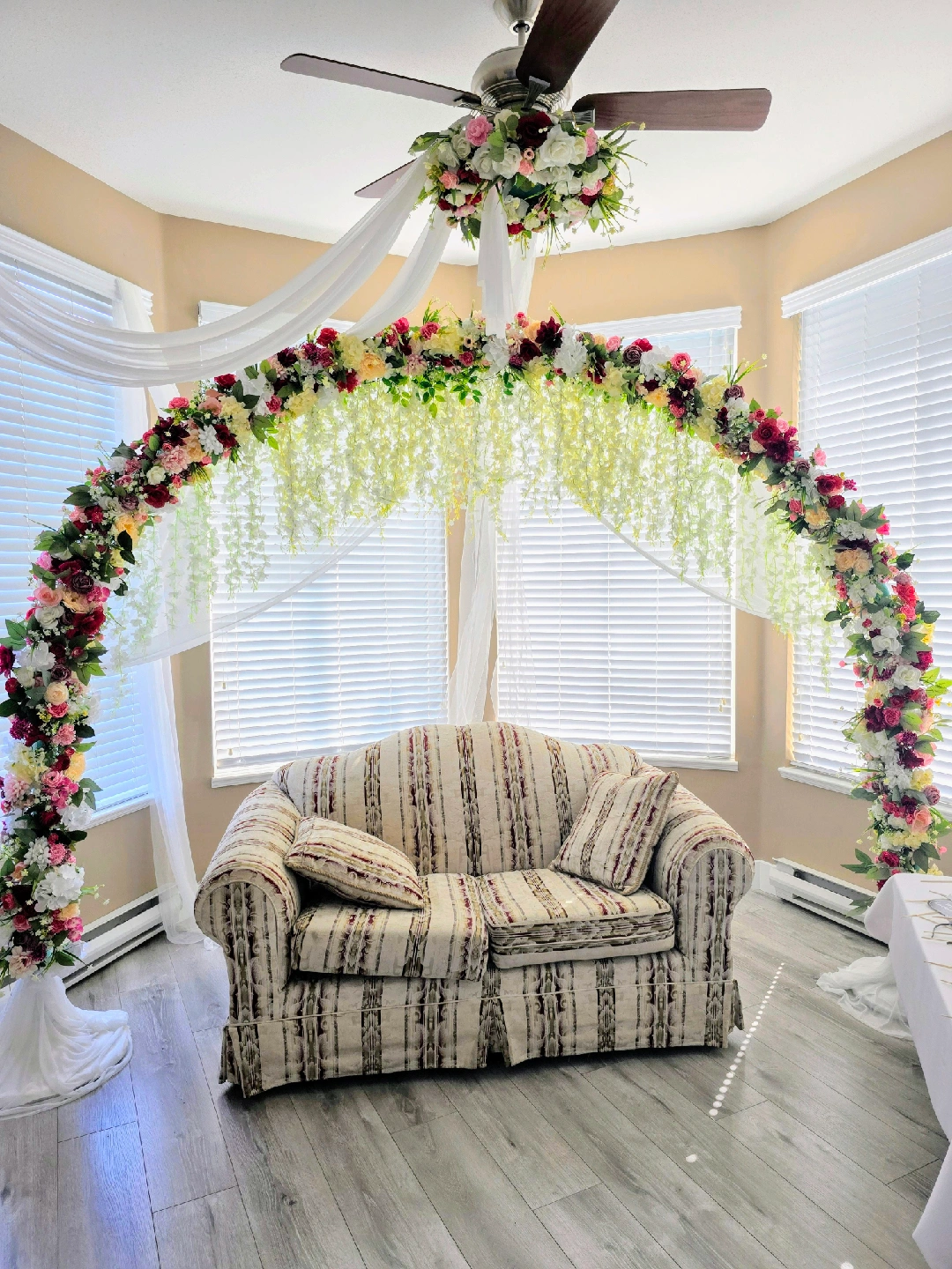 Beautiful floral wedding arch, perfect for creating a stunning backdrop for your special day! It features a lovely arrangement of flowers and flowing fabric. It's in great condition and ready to make your wedding unforgettable Huge 9ft tall arch. The length is also 9ft. Much bigger than any other arch on the market. you can also very easily adjust the width and height as the arch is very flexible It's not ridged so you can also bring the legs of the arch closer together or further apart. It's currently disassembled into several parts. The long pool noodles you see in the video are broken up into 5 pieces I believe. It's easy to assemble. I was able to do it on my own in 5 mins. The entire thing is handmade Chiffon curtains not included, if you want those as well, it's an extra $30 Cash and pick up only. FCFS