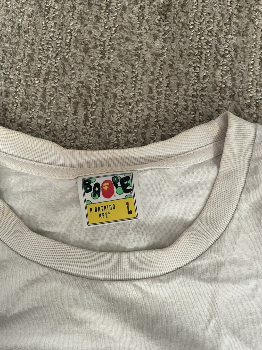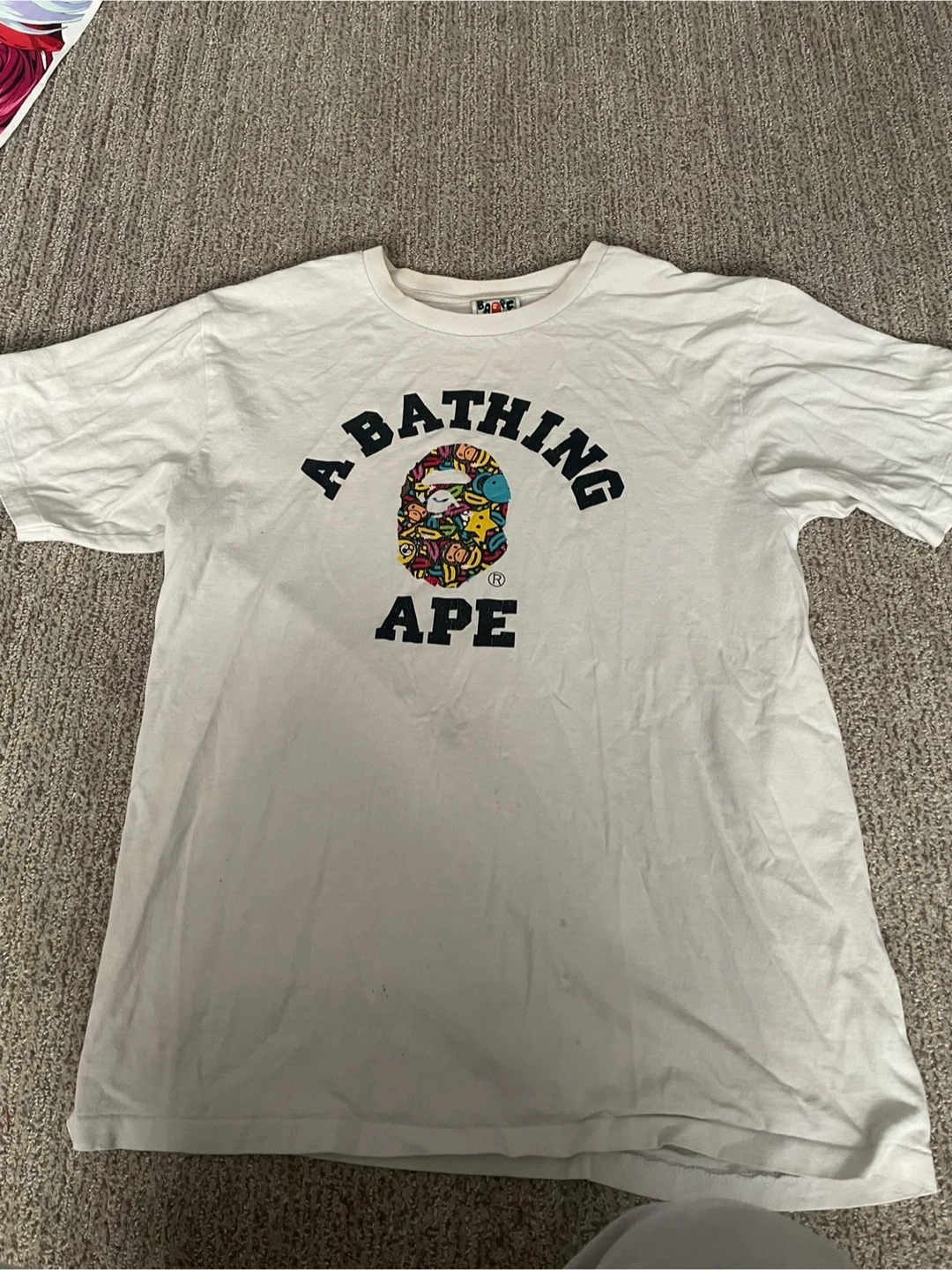 Selling an A Bathing Ape (BAPE) t-shirt in size Large! It's a classic white tee with the iconic BAPE logo. Please see photos for condition. Slightly used just don’t wear it anymore, 45$ OBO