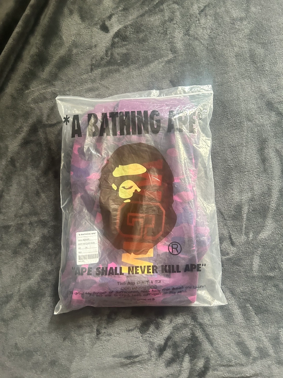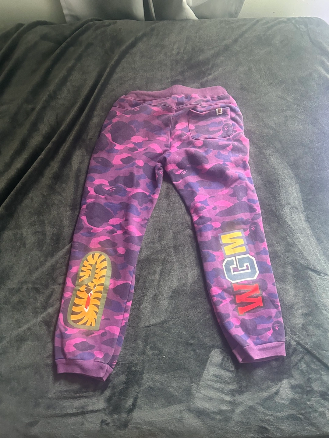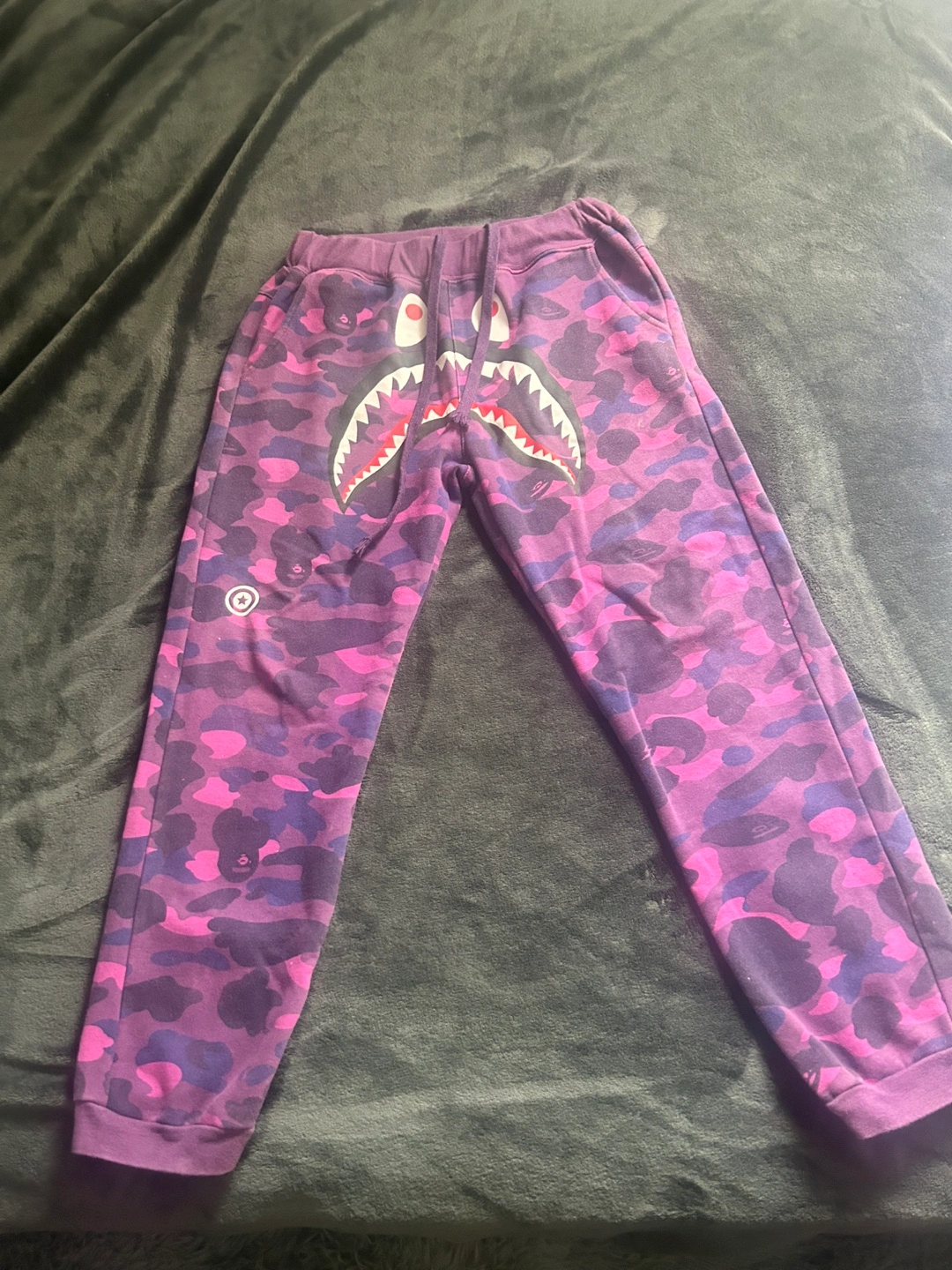 Men's purple camouflage sweatpants. Features a large shark mouth graphic on the front and Baby Milo graphic on the leg. Elastic waistband and cuffs. Comes in original packaging.