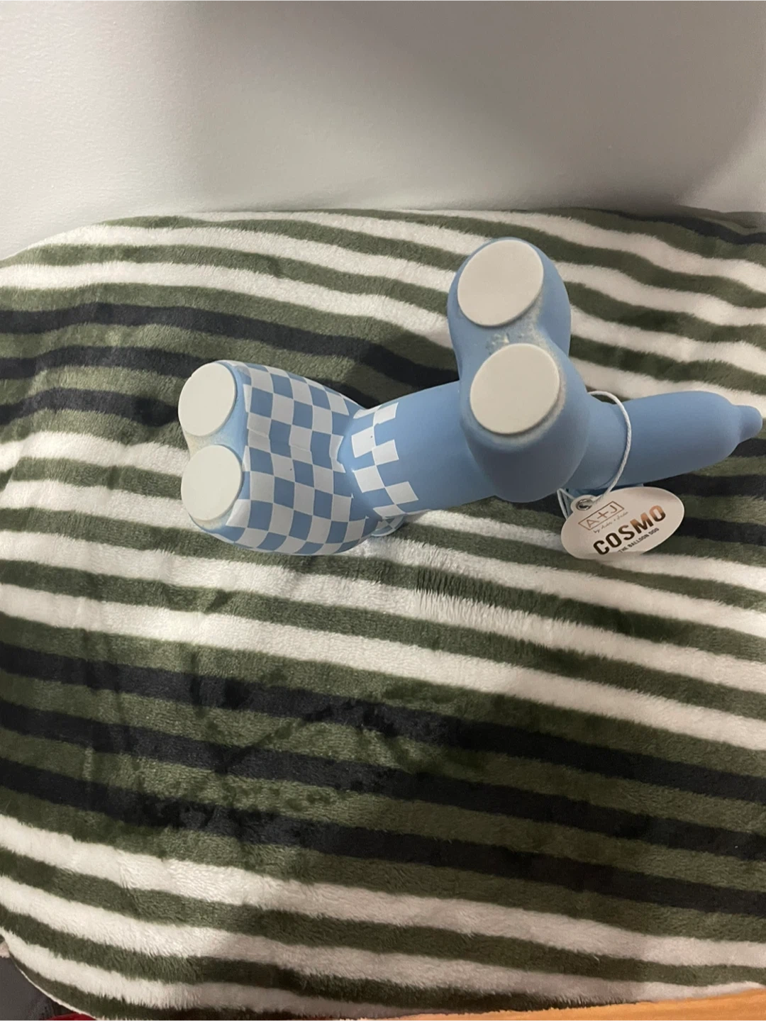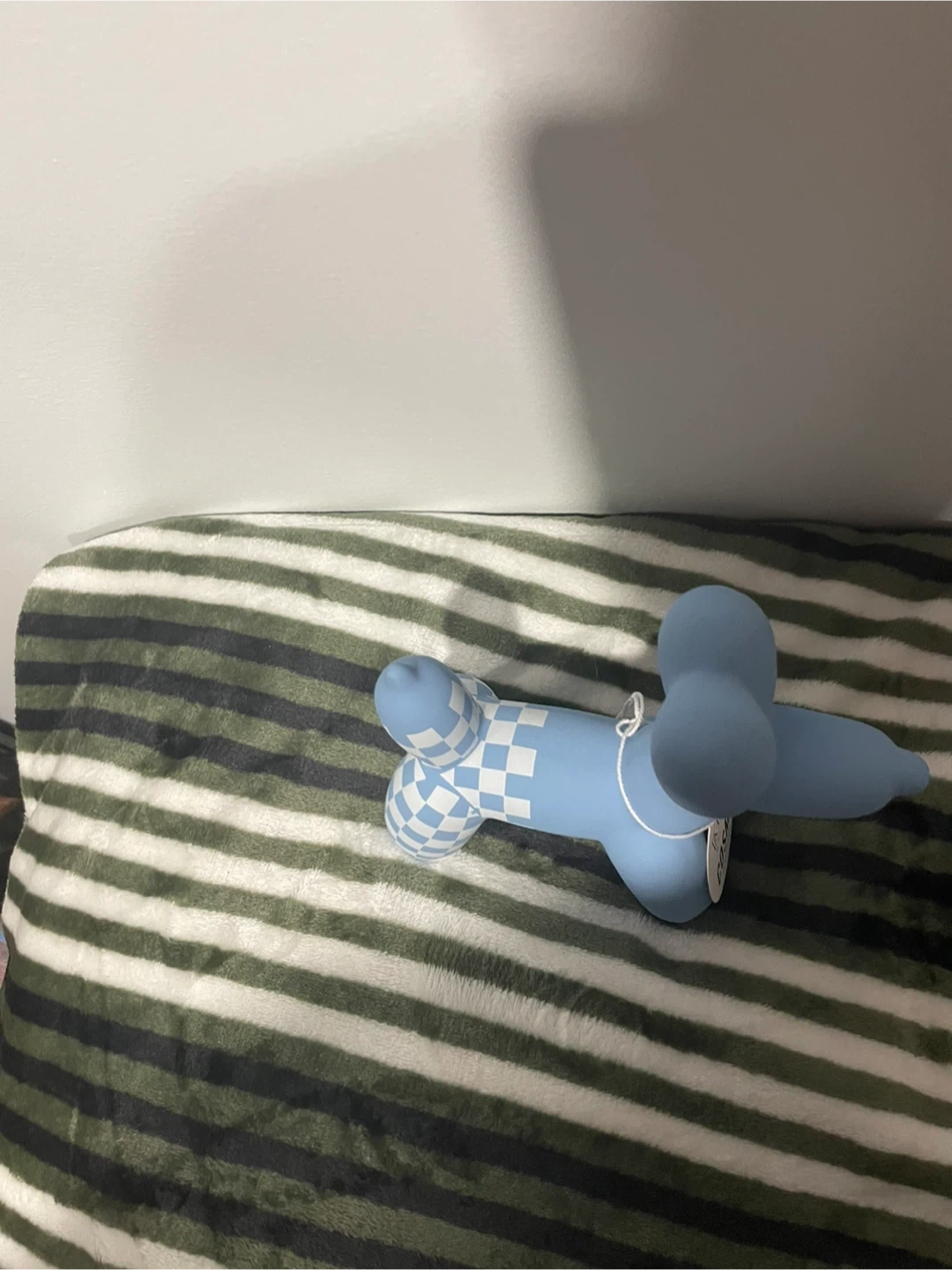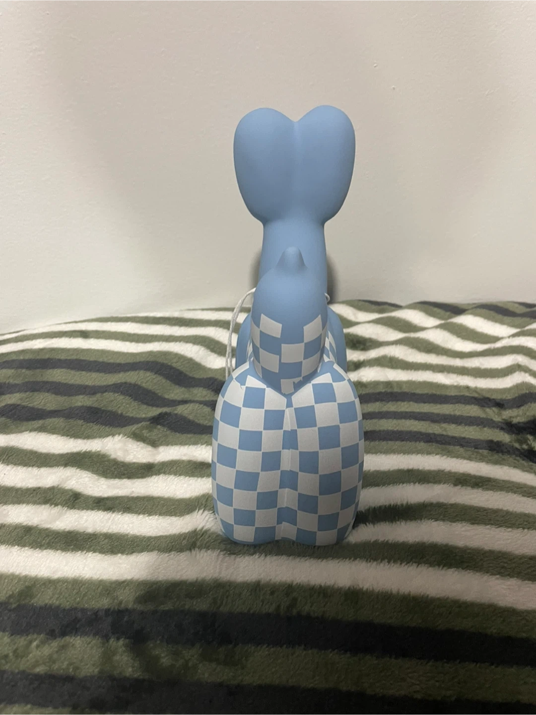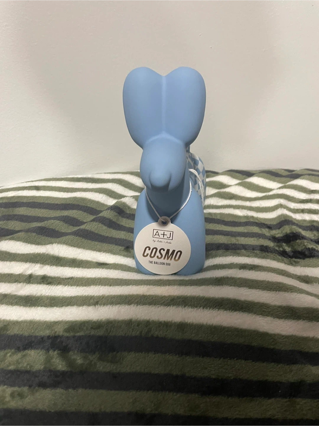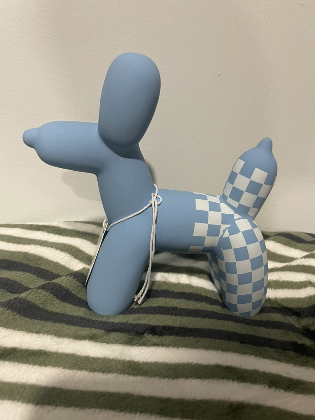 This is a cute A+J Cosmo The Balloon Dog figurine. It's blue with a white checkered pattern on the back. Would look great in a kid's room or anywhere you want to add a touch of whimsy!