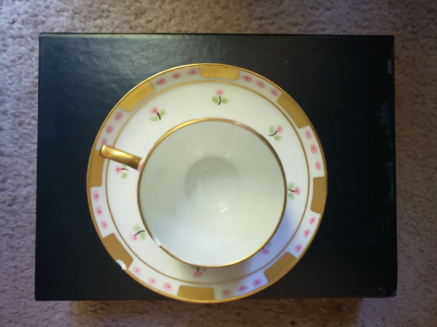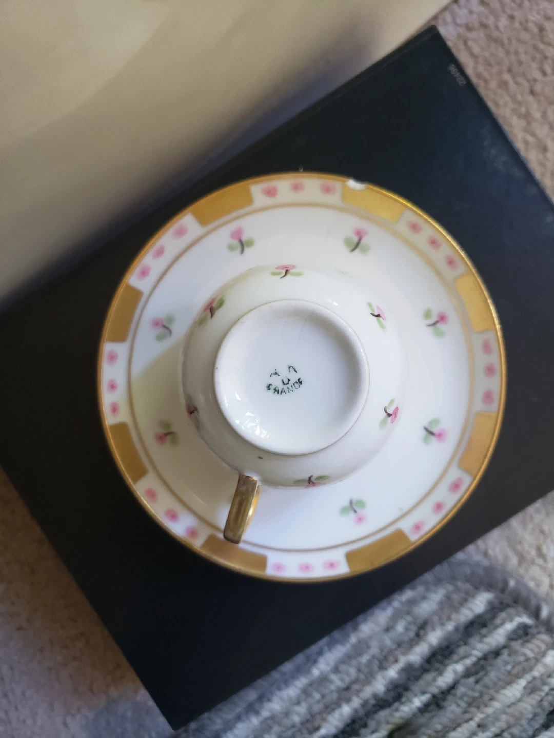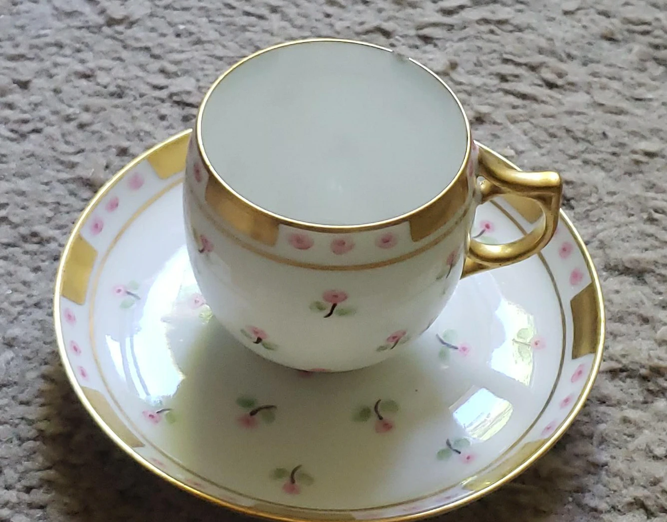 Selling a delicate A. L. France tea cup and saucer set. It features a white base with gold trim and sweet pink floral accents. Perfect for adding a touch of elegance to your tea time