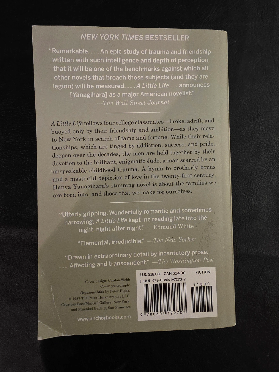 Selling the book "A Little Life" by Hanya Yanagihara. It follows four college classmates as they move to New York in search of fame and fortune. A remarkable story of trauma and friendship, it's a New York Times Bestseller and Man Booker Prize Finalist