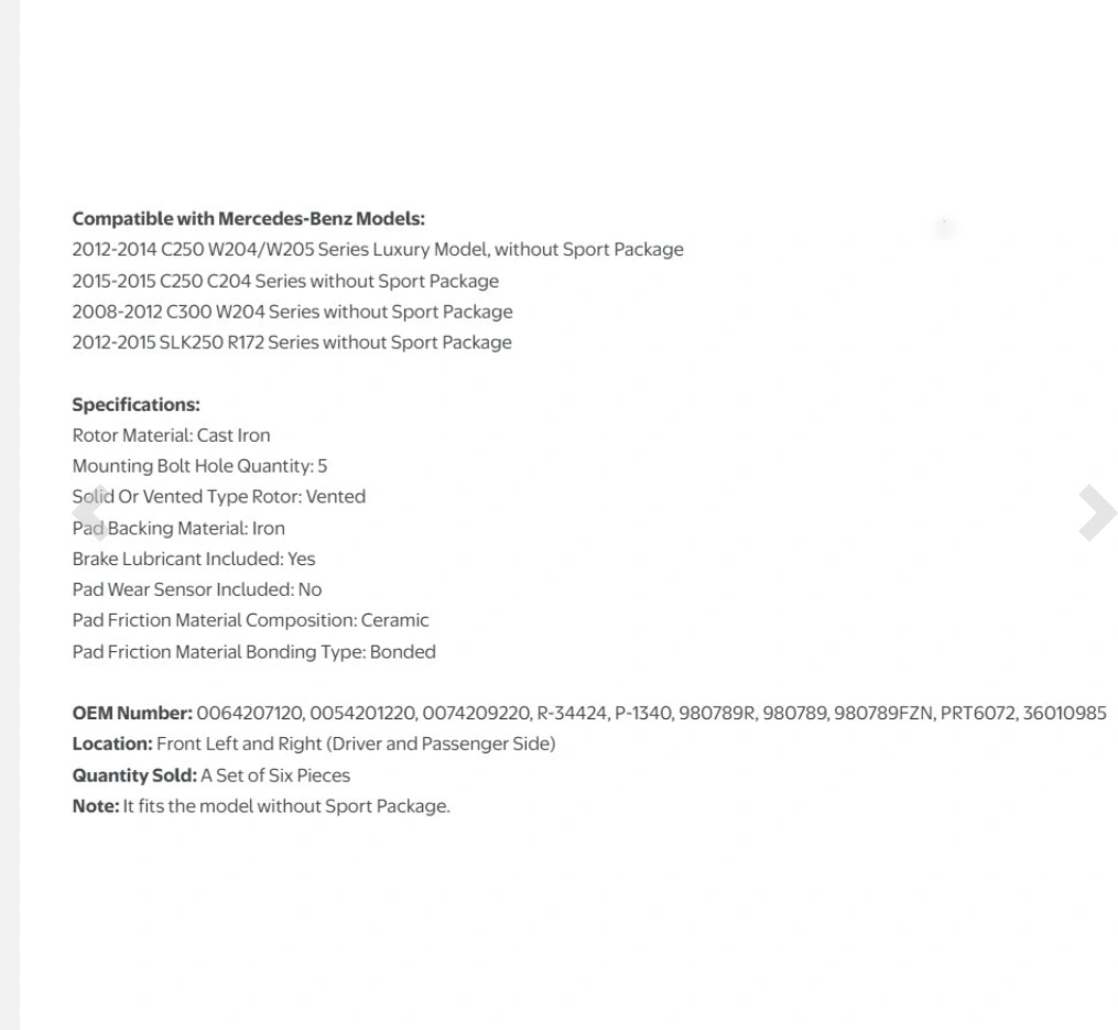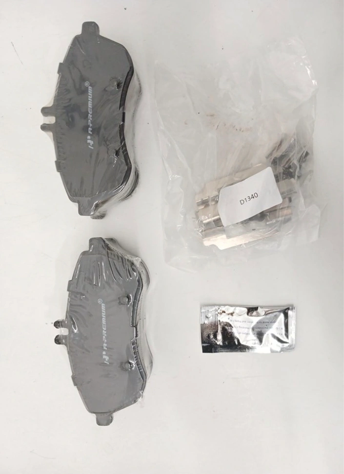 Selling a set of A-Premium ceramic brake pads compatible with Mercedes-Benz models from 2012-2015 without the sport package. These are designed for the front left and right (driver and passenger side). Rotor material is cast iron and the pad friction material is ceramic. Includes brake lubricant and a set of six pieces