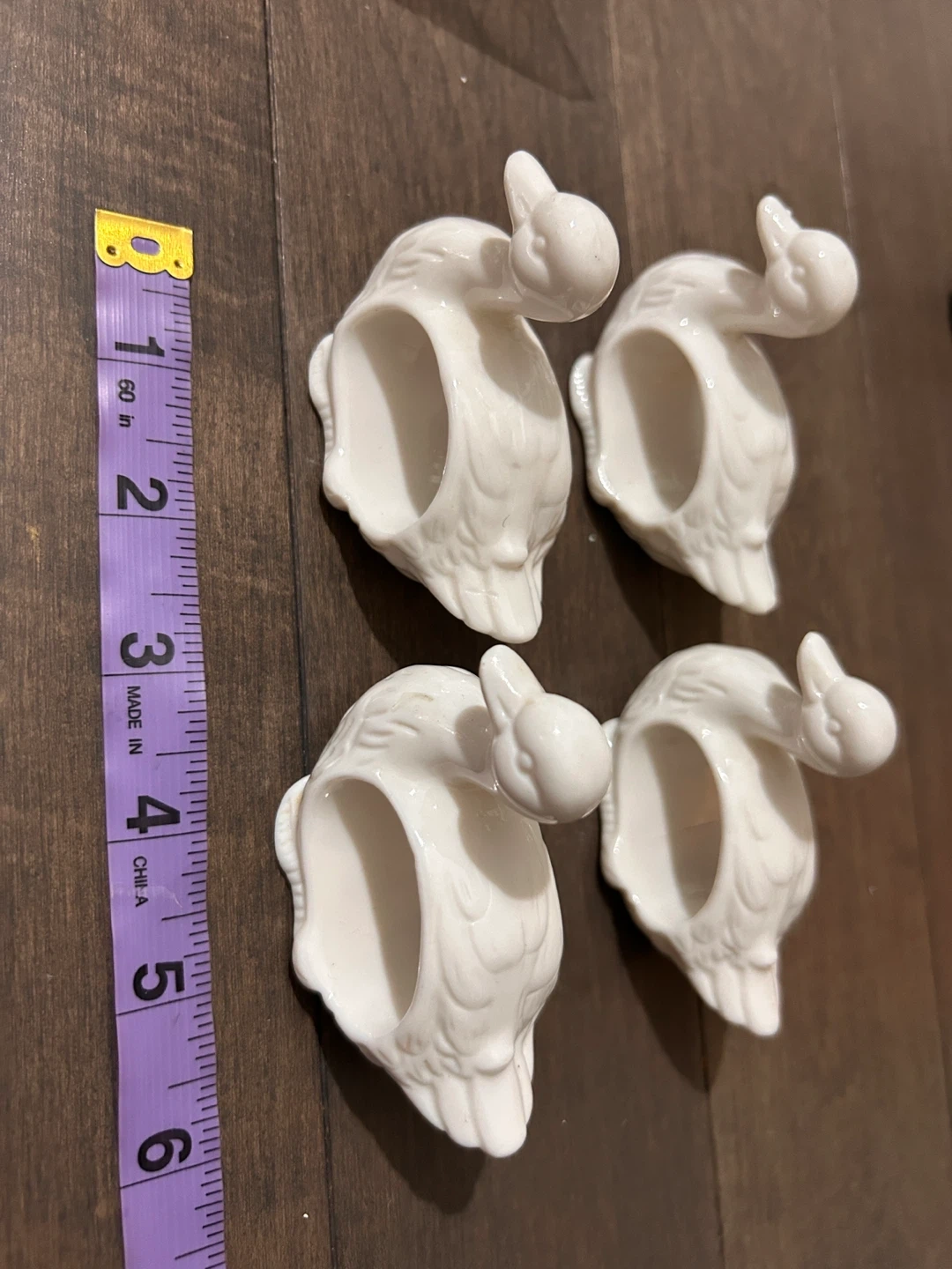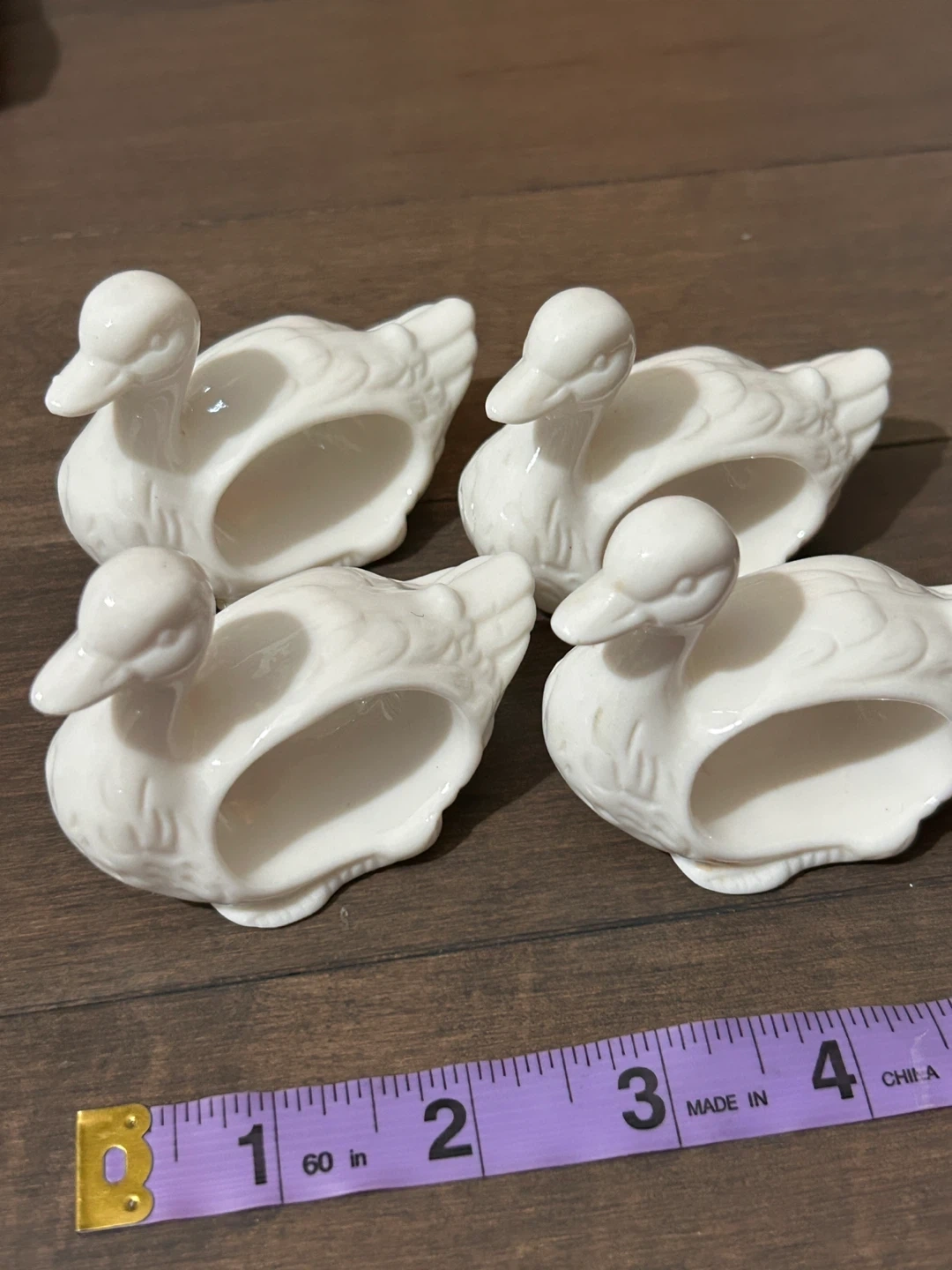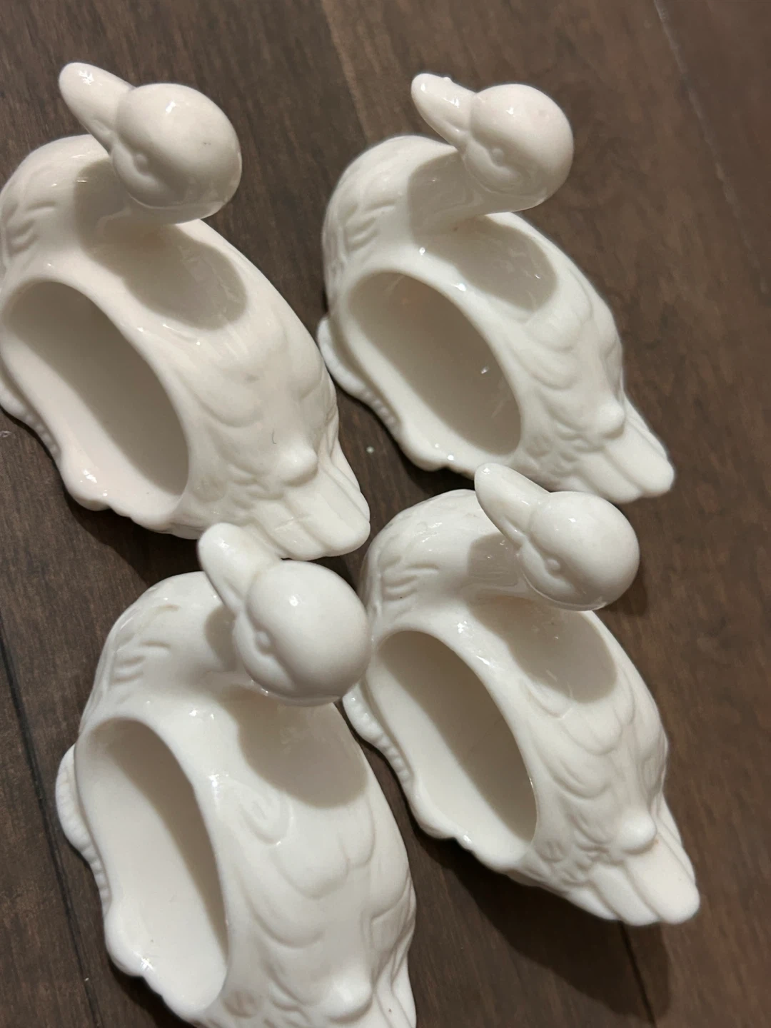 Here's a set of four adorable duck napkin rings by Abbott! They're in great shape and ready to add a touch of whimsy to your table setting. Each ring is made of a smooth, white material and features a cute duck design.