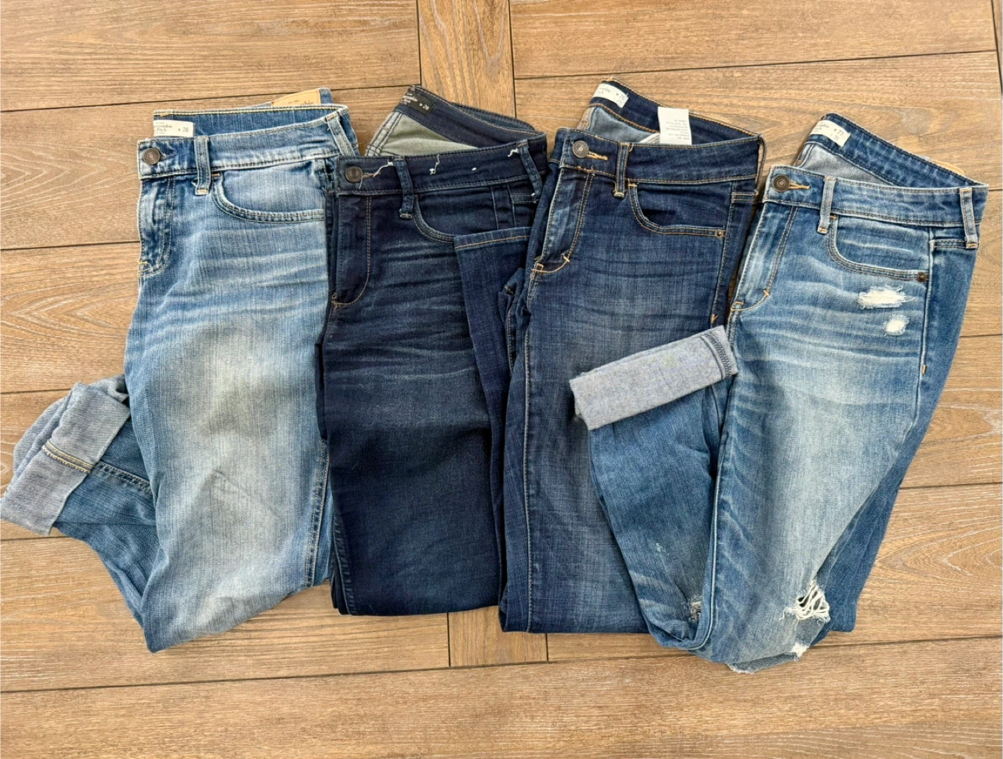 Selling a bundle of Abercrombie & Fitch jeans! There are a variety of washes and styles. Sizes include 26 (3 on the left side) and one size 27 on the right side. Bundle only. Not for individual sale.