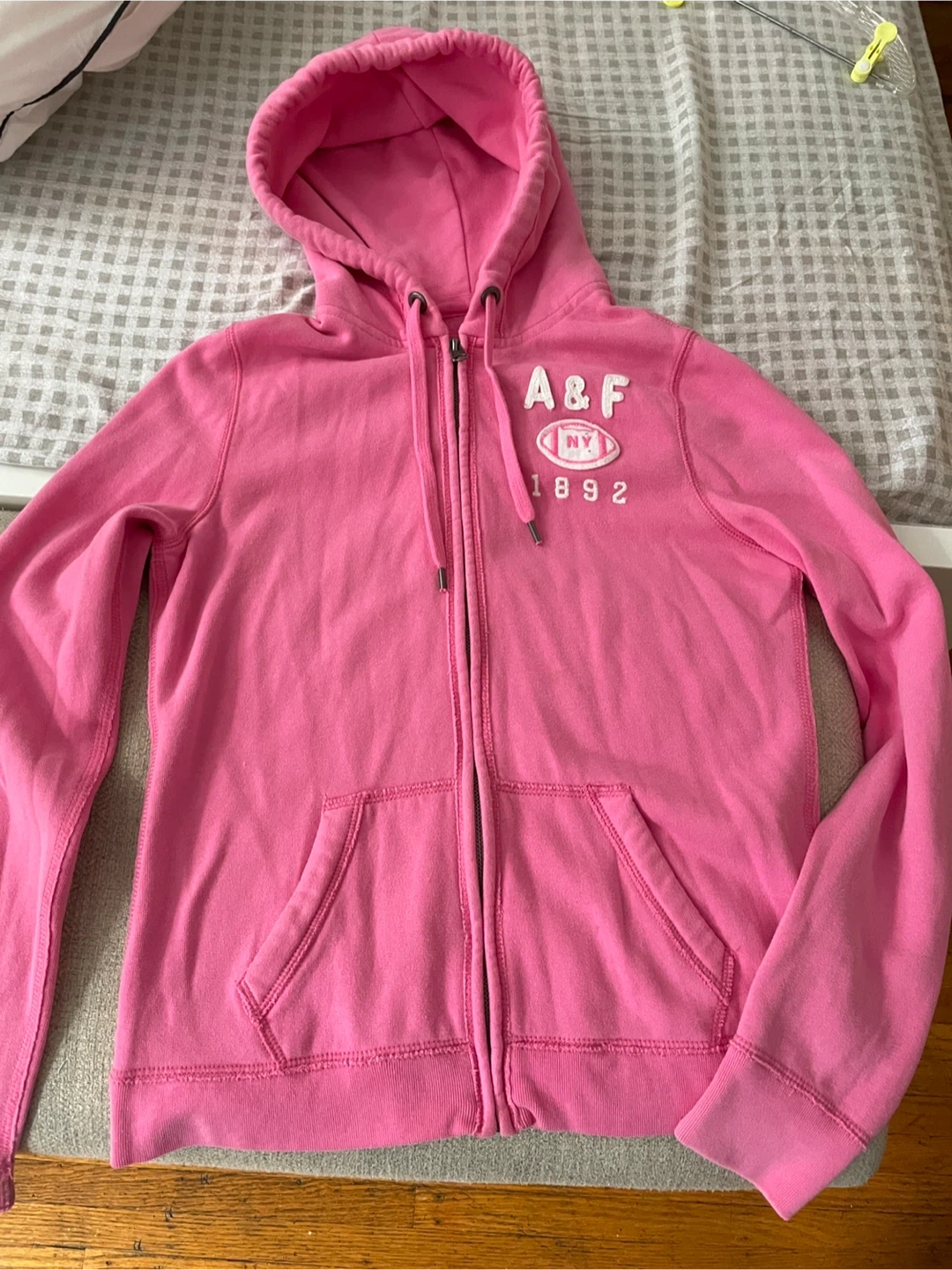 Selling a cute Abercrombie & Fitch full-zip hoodie in a lovely shade of pink! It's a size medium and in great condition. Perfect for layering or just cozying up on a chilly day