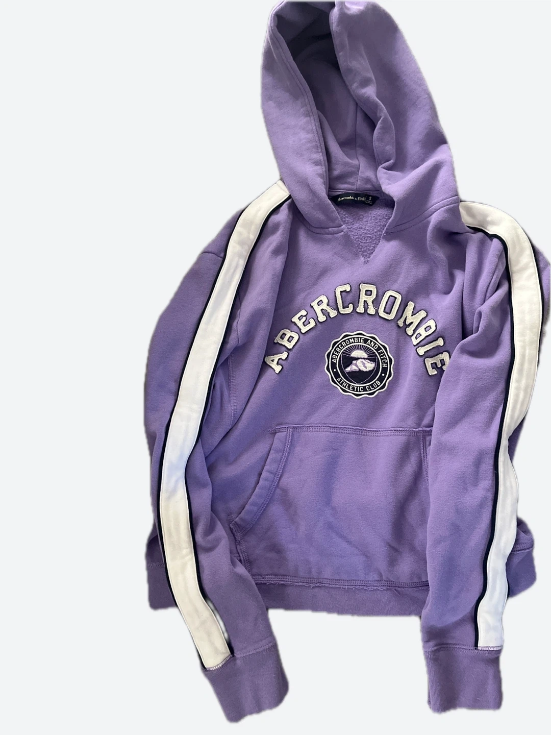 Cozy Abercrombie & Fitch hoodie in a lovely shade of purple! It's a size small and features white stripes down the sleeves. Perfect for staying warm and stylish on cooler days. It's in good condition and ready for a new home!