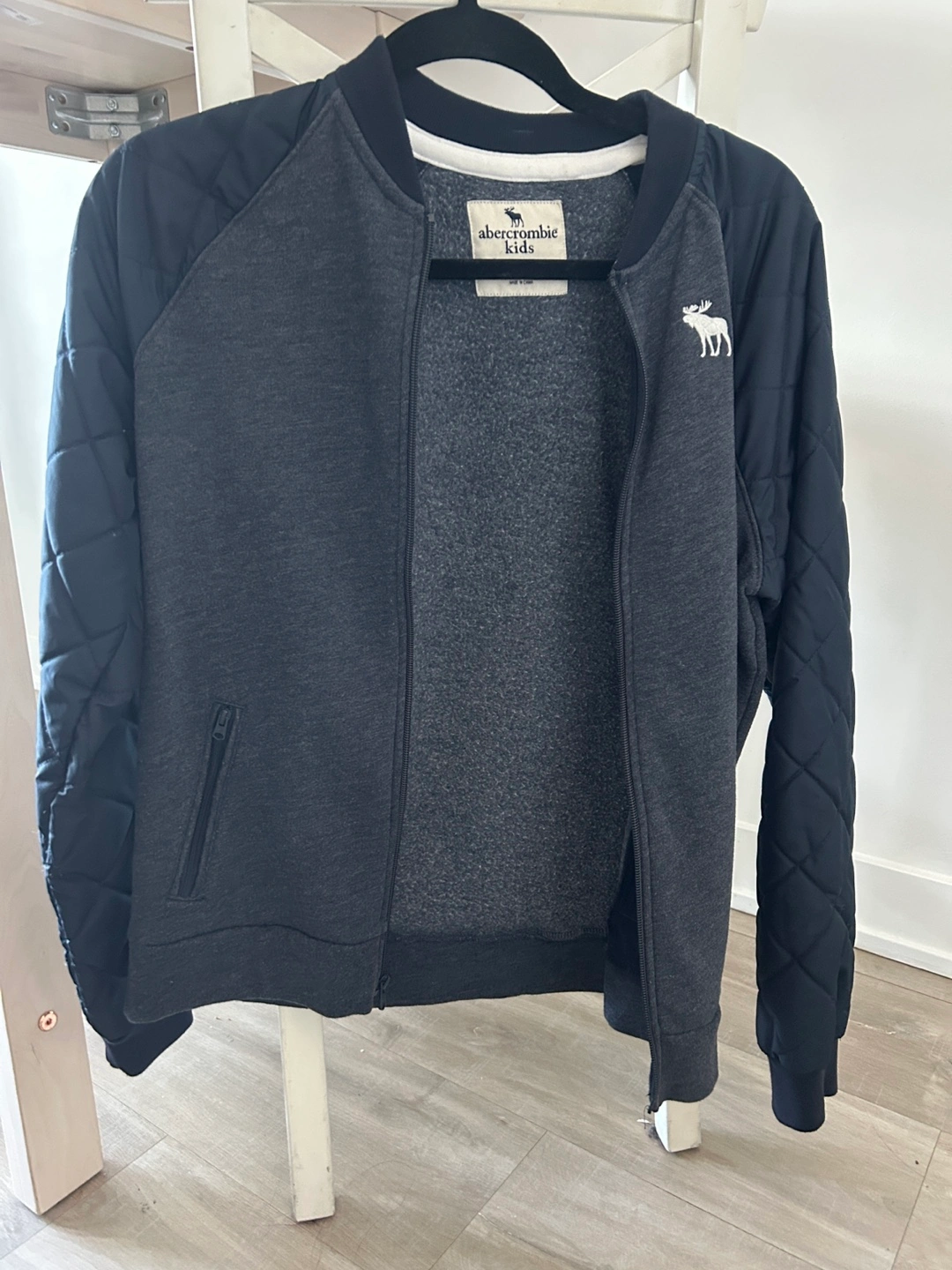 Selling an Abercrombie Kids bomber jacket in size L (14). It's a stylish and comfortable jacket, perfect for layering! The jacket features a grey body with quilted navy blue sleeves. It's in great condition and ready for a new home. Pet, bug and smoke free household Rfs: i gained weight :)) Meetup along bloor-yonge to union station line 1 ttc