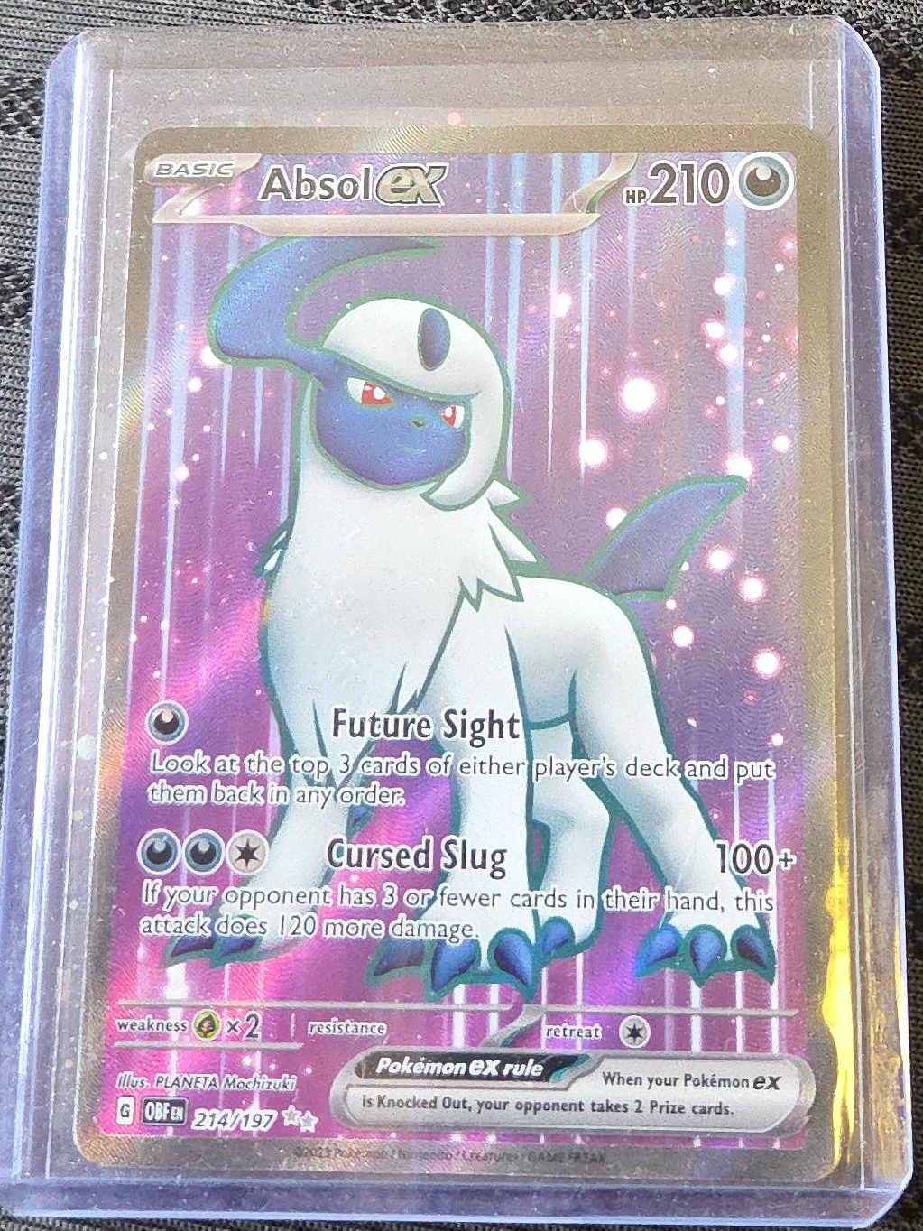 Selling an Absol EX Pokemon card in excellent condition! It's a Basic card with 210 HP. The card features the 'Future Sight' and 'Cursed Slug' attacks. A great addition for any collector!
