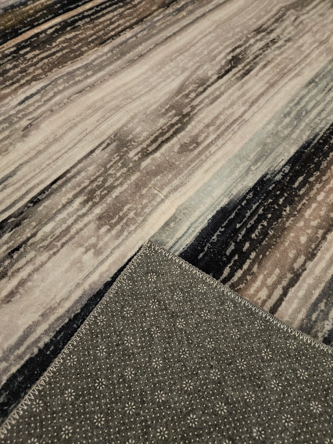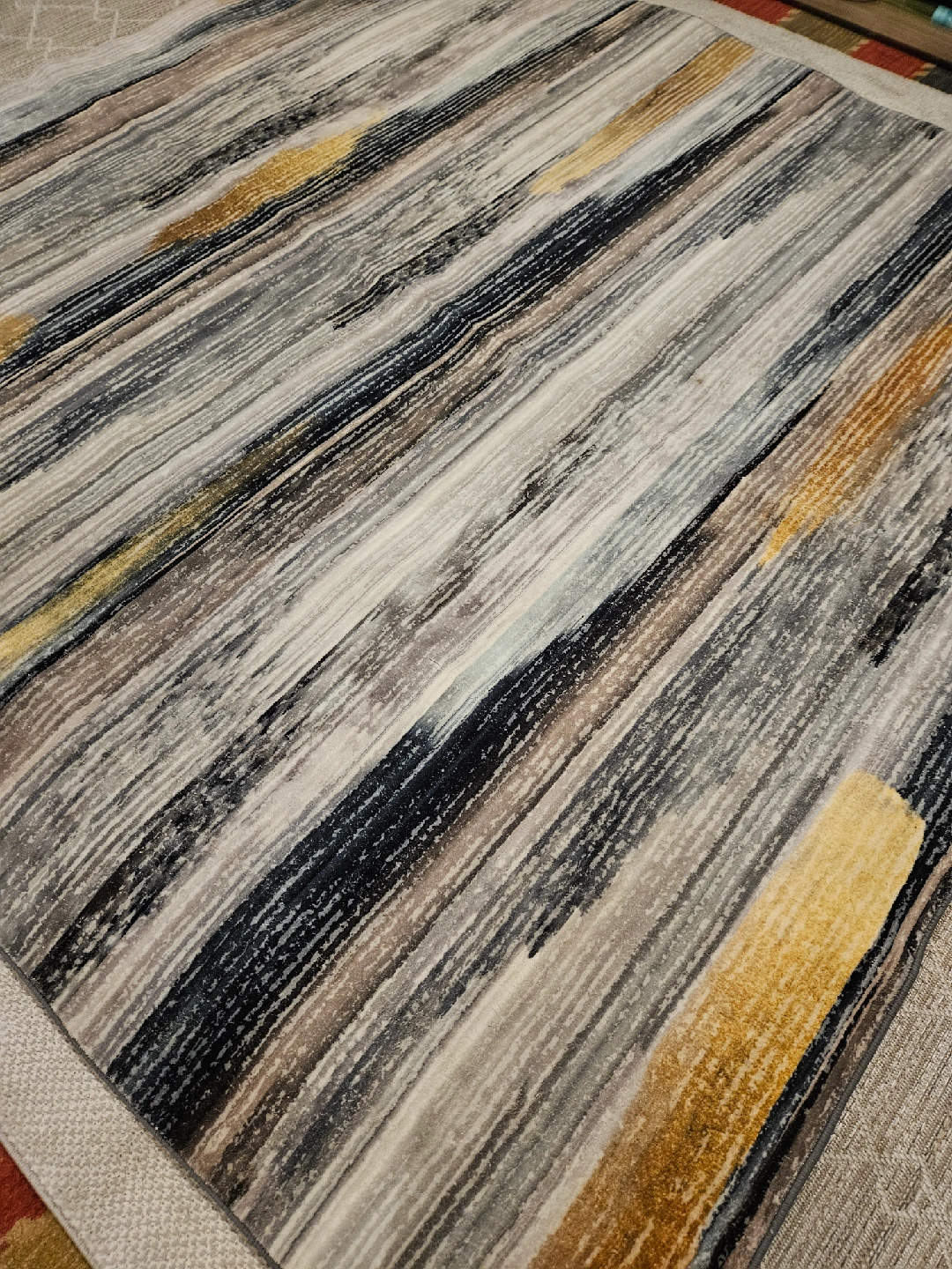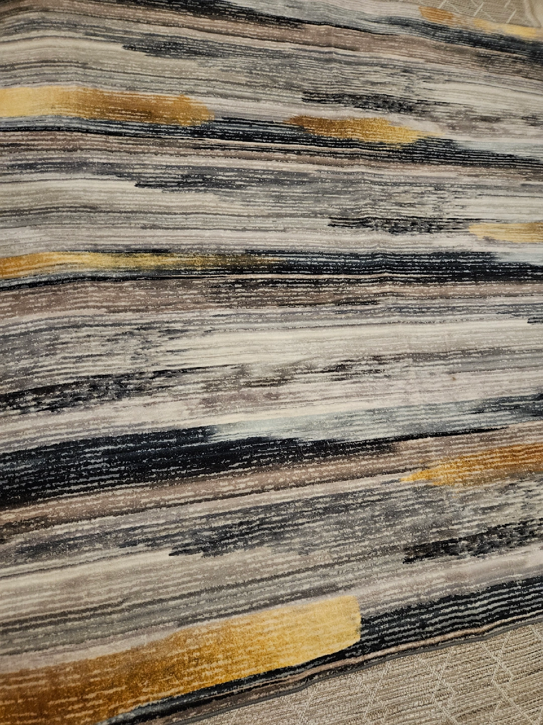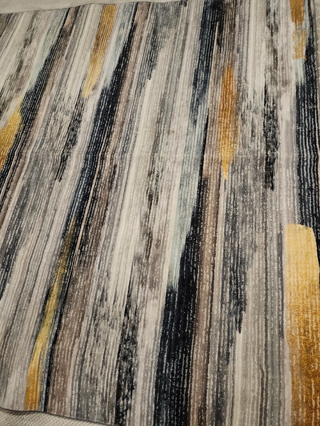 Selling a stylish abstract area rug with a modern design! It features a blend of grey, beige, and black tones, creating a sophisticated look. The rug is in great condition and would be a perfect addition to any living room, bedroom, or office space