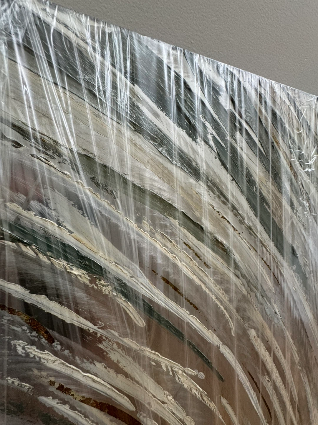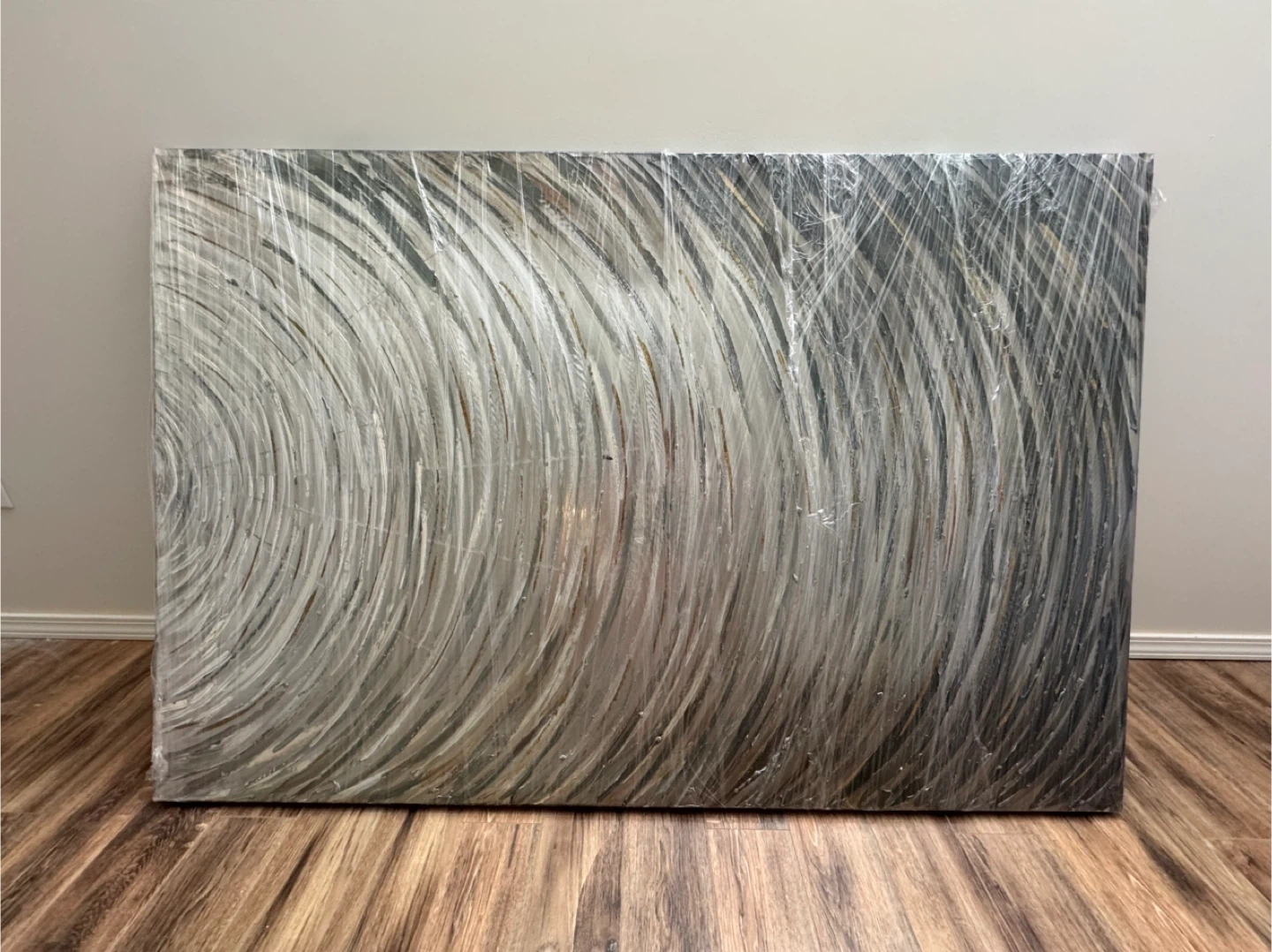 Selling an abstract art canvas. It's a unique piece that could add a touch of modern flair to any room. The canvas features a swirling pattern with shades of grey, gold white, & black. It's still in its original packaging! Paid. $509. Urban Barn