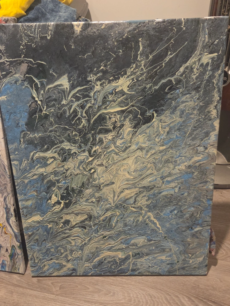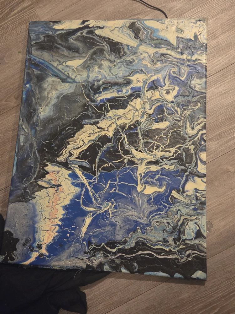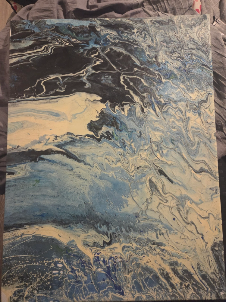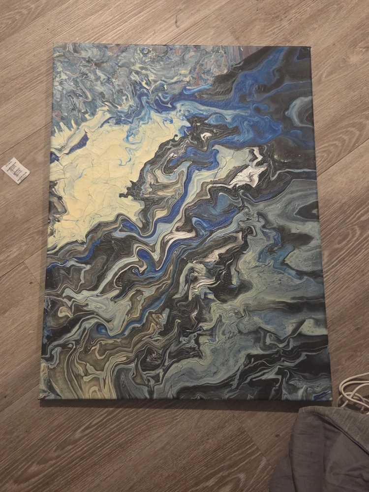 Selling a unique abstract art painting. It features a blend of blue, white, and black colours, creating a mesmerizing marbled effect. Perfect for adding a touch of modern artistry to any room